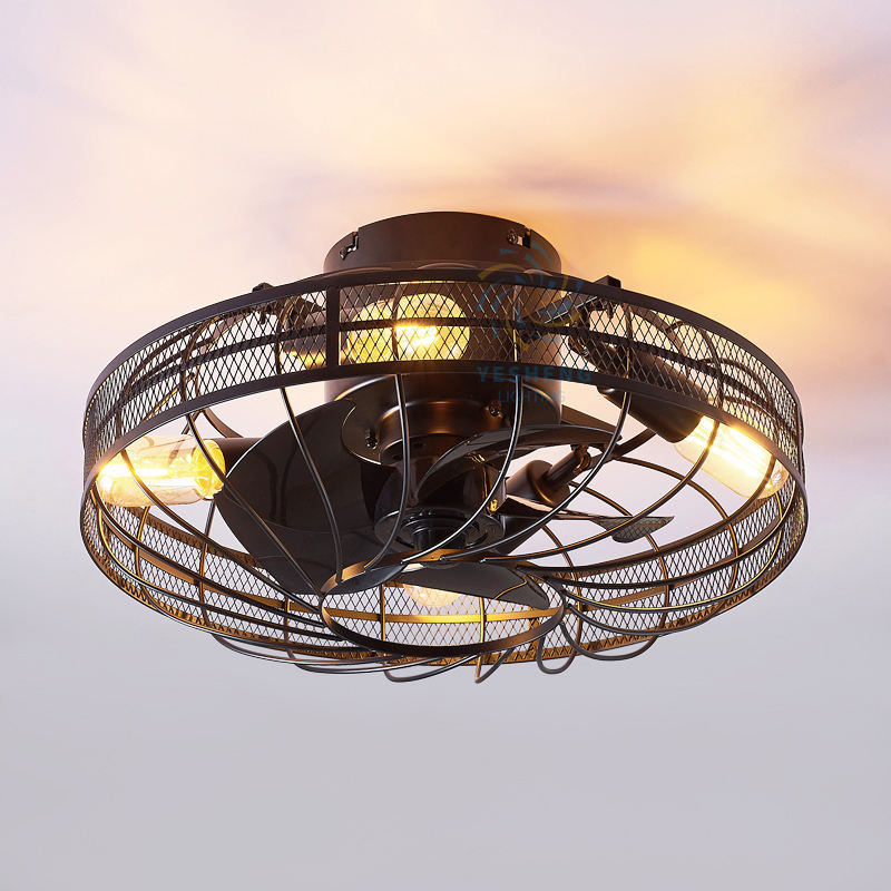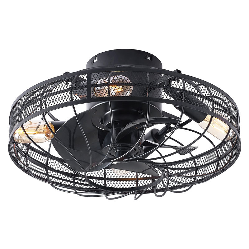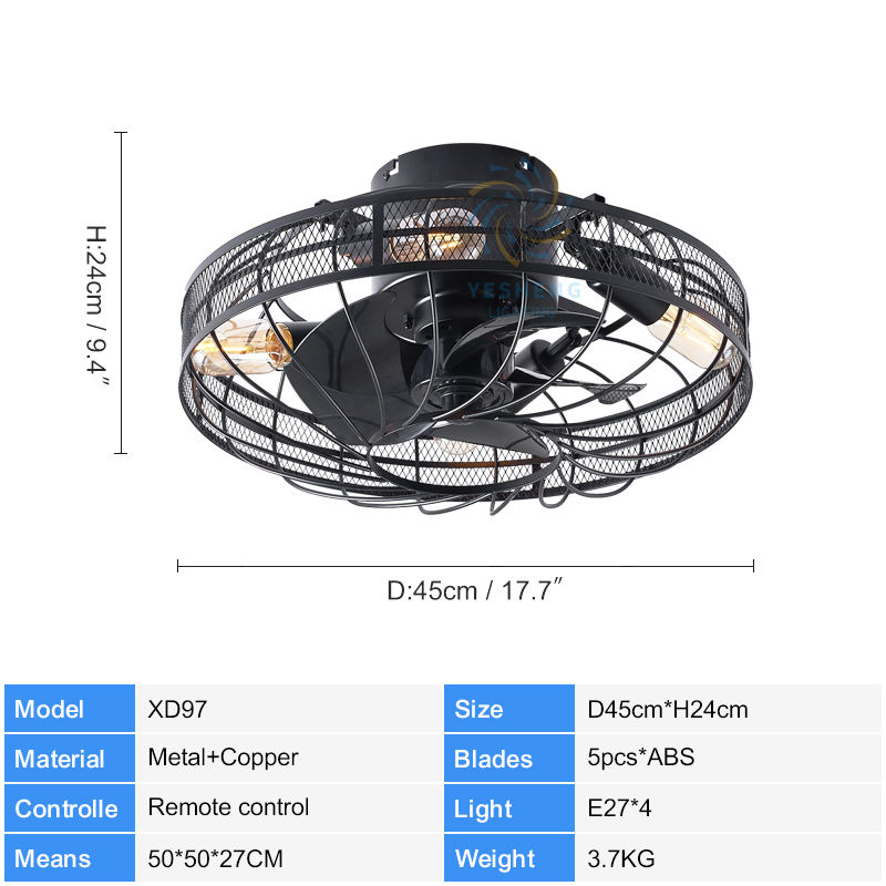 XD97 ventilateur de plafond industriel vintage à 4 lumières à profil bas avec lumière noire en métal Cage ventilateur de plafond pour restaurants de ferme