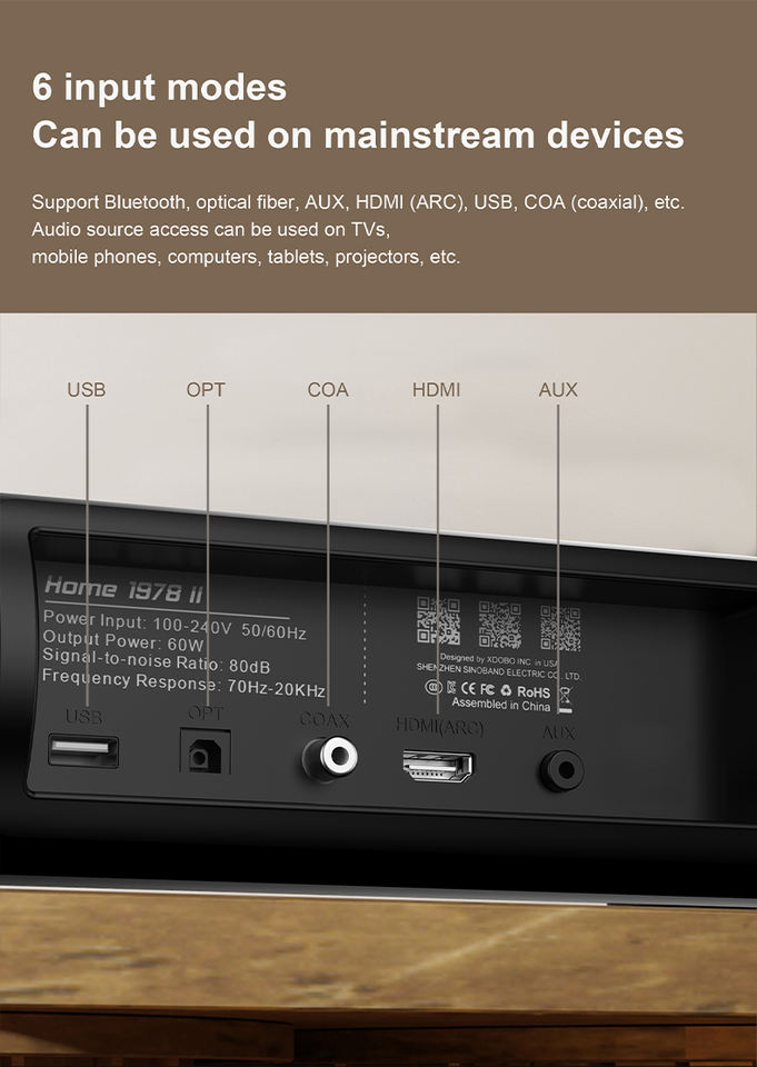 Barre de son XDOBO Home 1978 II 80W Bluetooth avec 1 ARC Optique USB BT Coaxial 4 Haut-parleurs Système audio mural