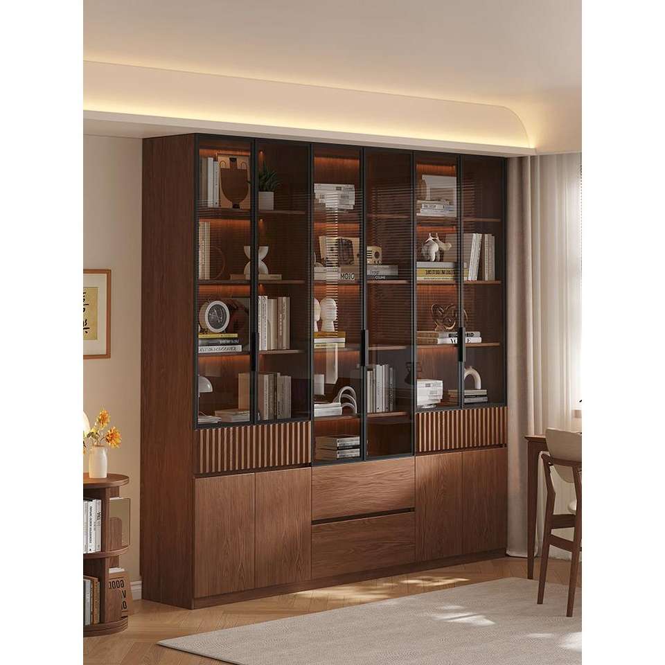 Bibliothèque en bois massif XHA, armoire de rangement pour bureau avec portes en verre, design minimaliste, bois de noyer noir.