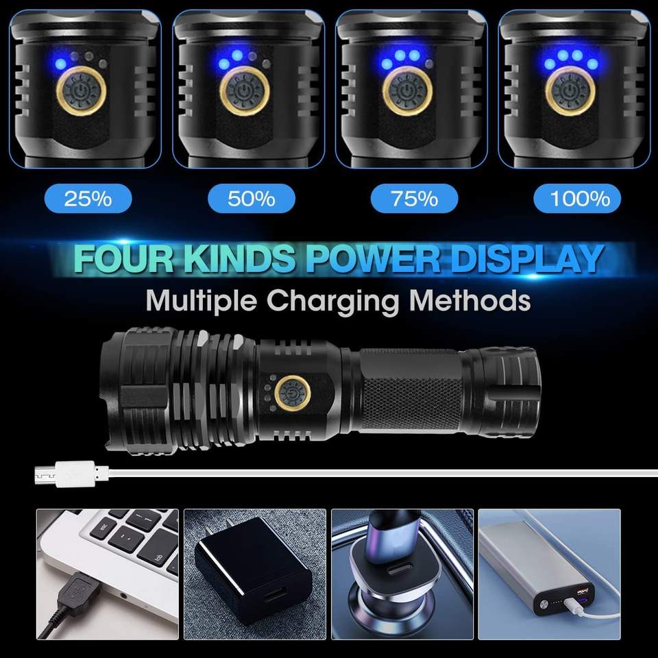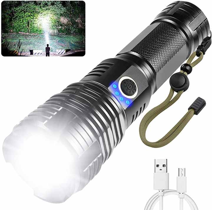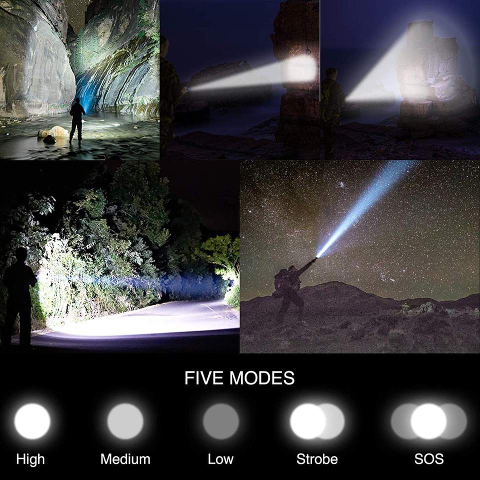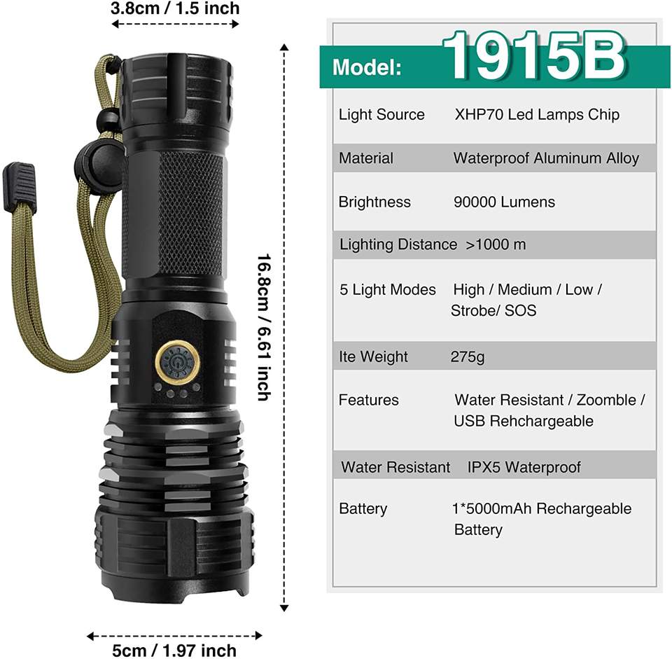 Lampe torche LED XHP70 5 modes Lampe torche zoomable IPX5 étanche Rechargeable par USB Lampe torche 90000 lumens pour le camping en plein air
