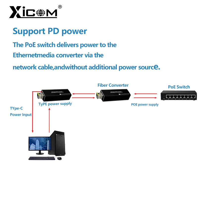 Convertisseur de média fibre optique XICOM Mini SFP RJ45 avec récepteur d'alimentation PoE 5V DC et port Type-C