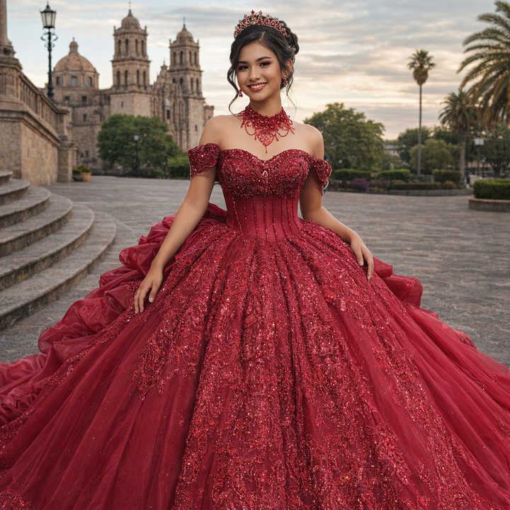 Robe de bal Quinceañera élégante rouge à volants et décolleté cœur avec corset, perles et appliqués, taille naturelle, écologique - Modèle XS262