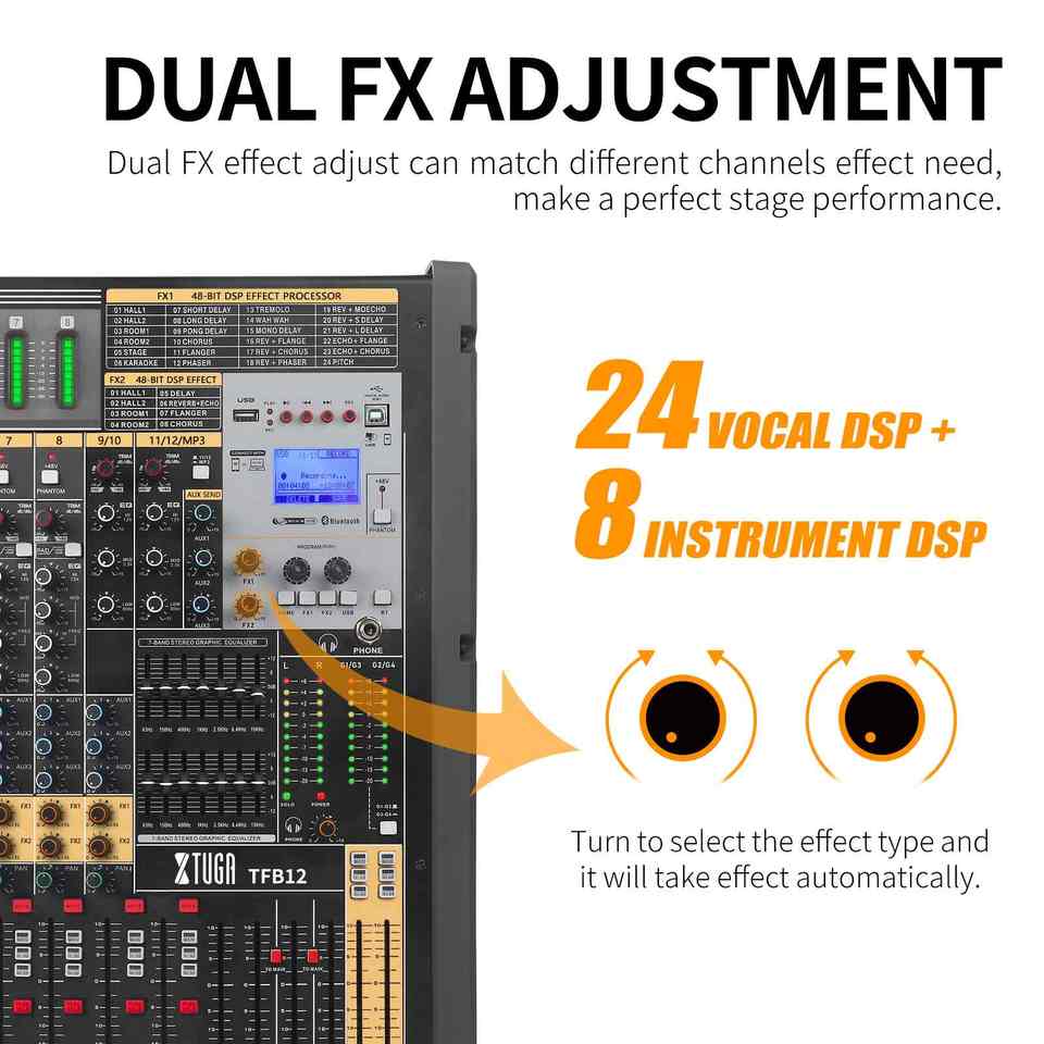 Console de Mixage DJ Professionnelle XTUGA TFB-24 24 Canaux avec 24 Effets DSP, Alimentation Phantom 48V / USB, Construction en Métal et ABS