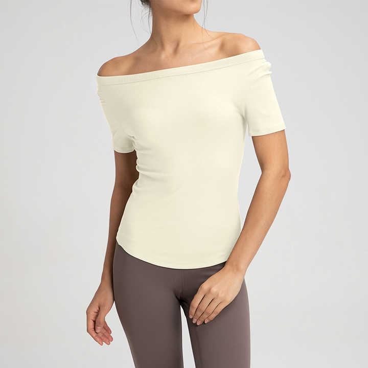 XW-DA110 élégant bateau décolleté ourlet arrondi dames en plein air Gymwear côtelé à manches courtes haut court respirant Sport chemise femmes