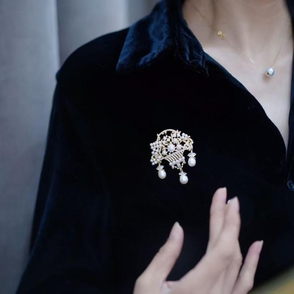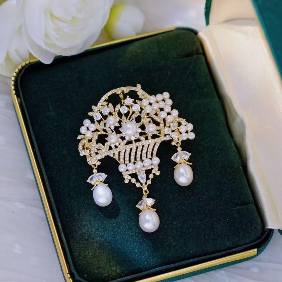 Xiaohongshu-recommended Retro Palace Style Su Flower Basket Popular Freshwater Pearl Chest Fashion Brooches Natural Beauty