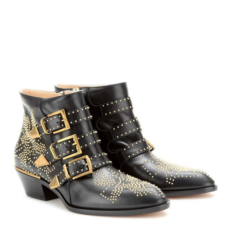 Bottes à talons épais pour femmes Xinzirain, personnalisées avec strass, en cuir véritable imprimé, avec boucle de ceinture à rivets et bride à la cheville