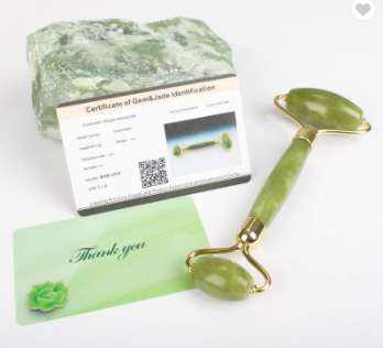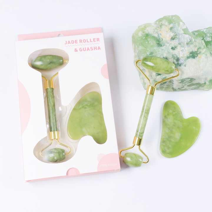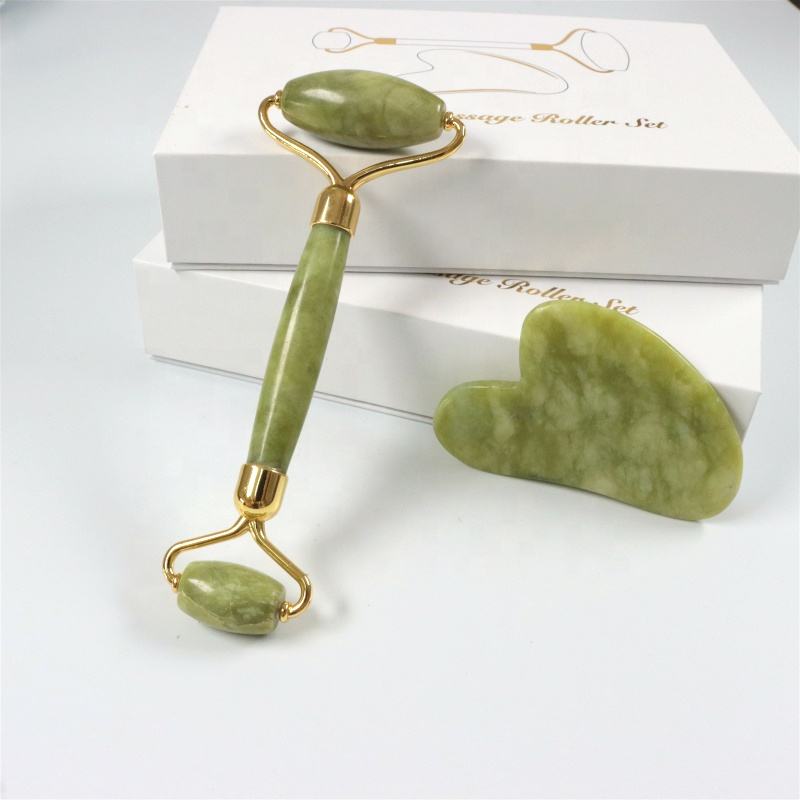 Ensemble de rouleau de jade et de gua sha en néphrite naturelle Xiuyan avec logo personnalisé, en pierre verte de type calcaire, à picots, pour le massage du visage, avec boîte, offrant des bienfaits de lifting du visage