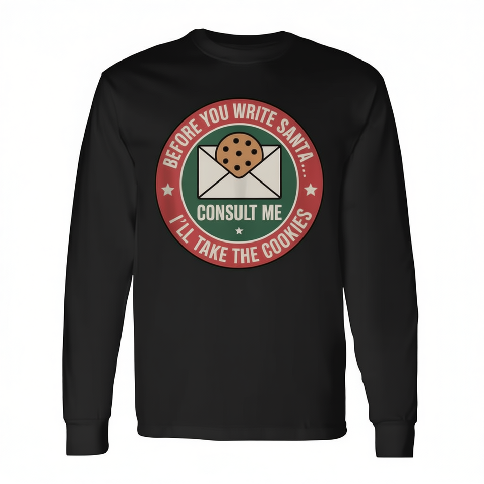 T-shirt unisexe à manches longues et col rond pour adulte, motif 'Biscuit de Noël Avant de Écrire au Père Noël', vêtement promotionnel imprimé en sérigraphie