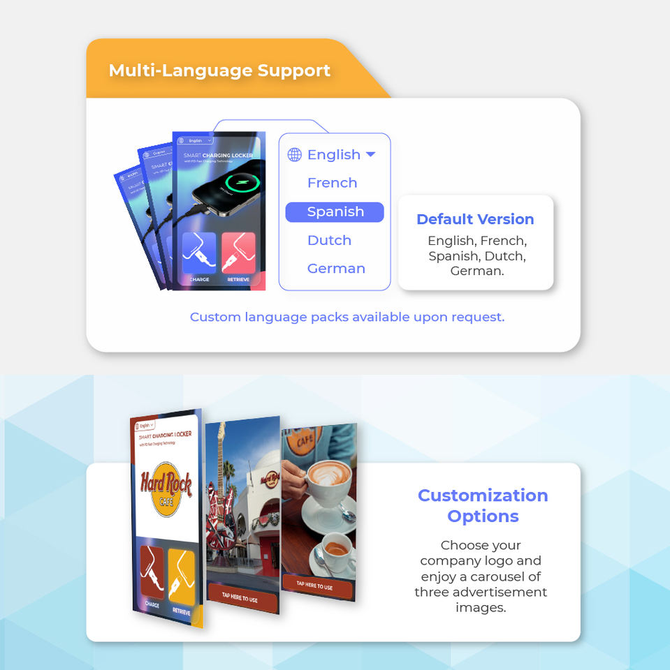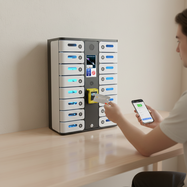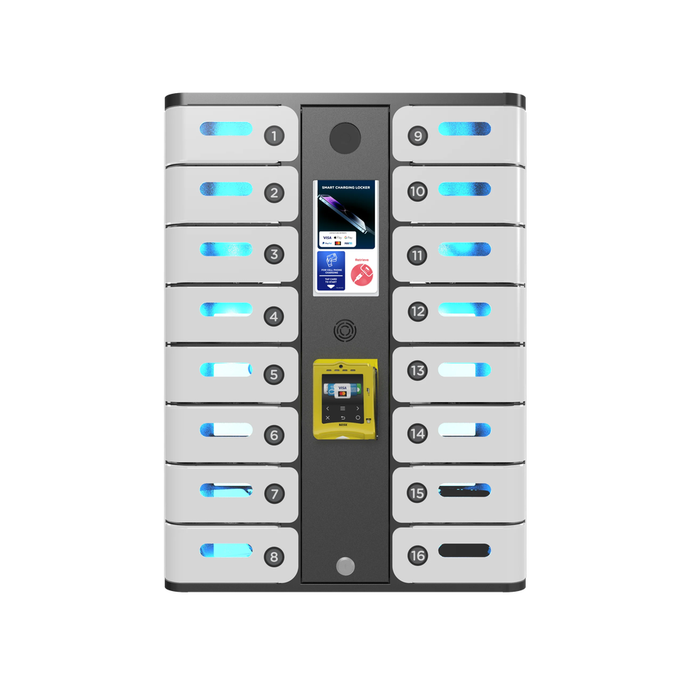 Y2 Power Max, casier de recharge pour téléphones portables à 16 compartiments avec support de terminal de carte de crédit, paiements flexibles, installation facile