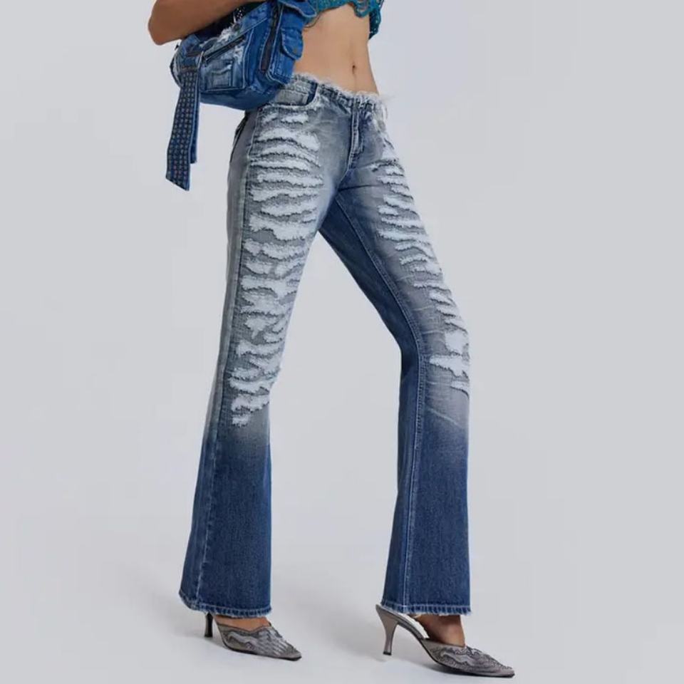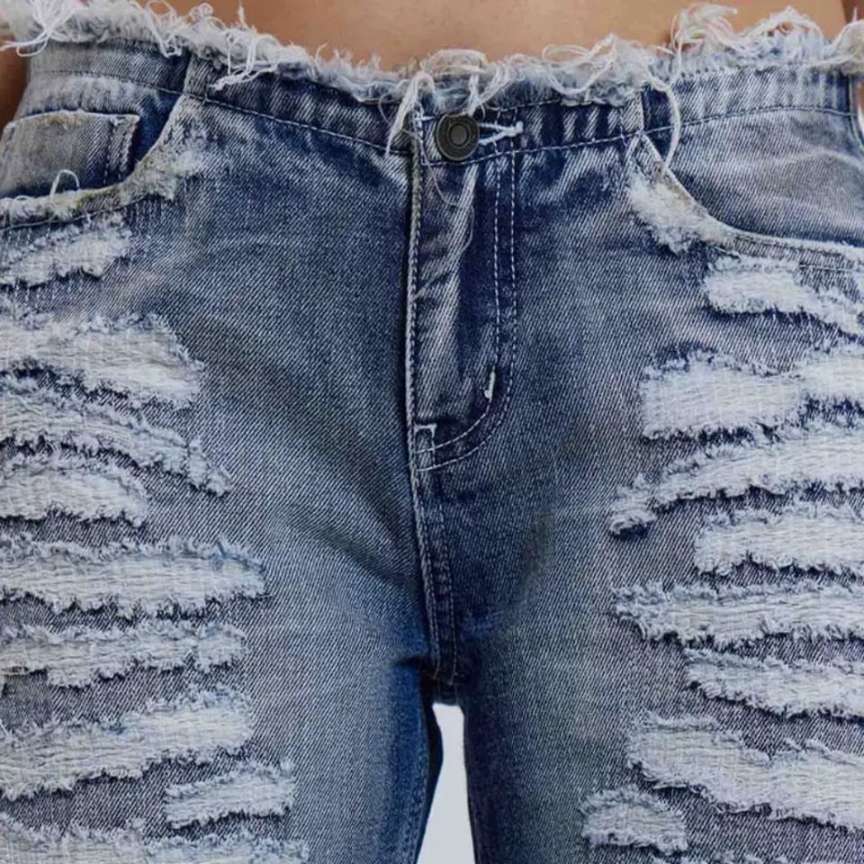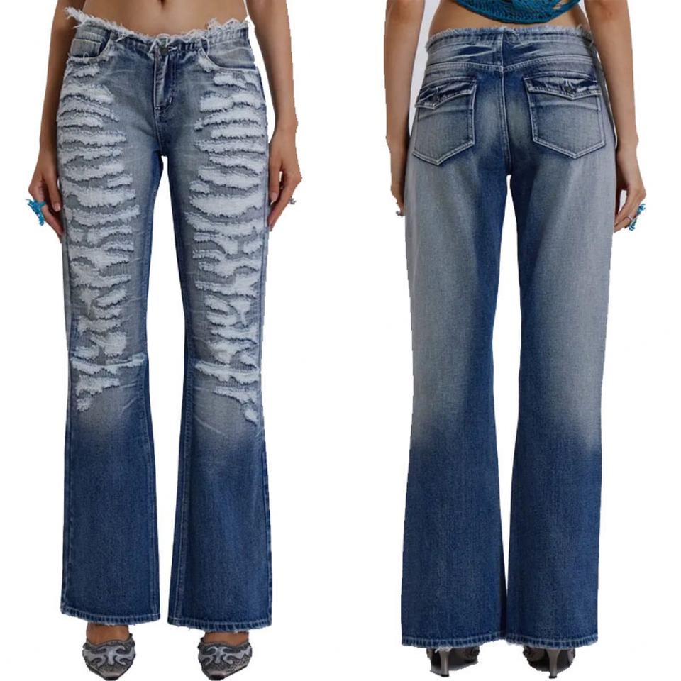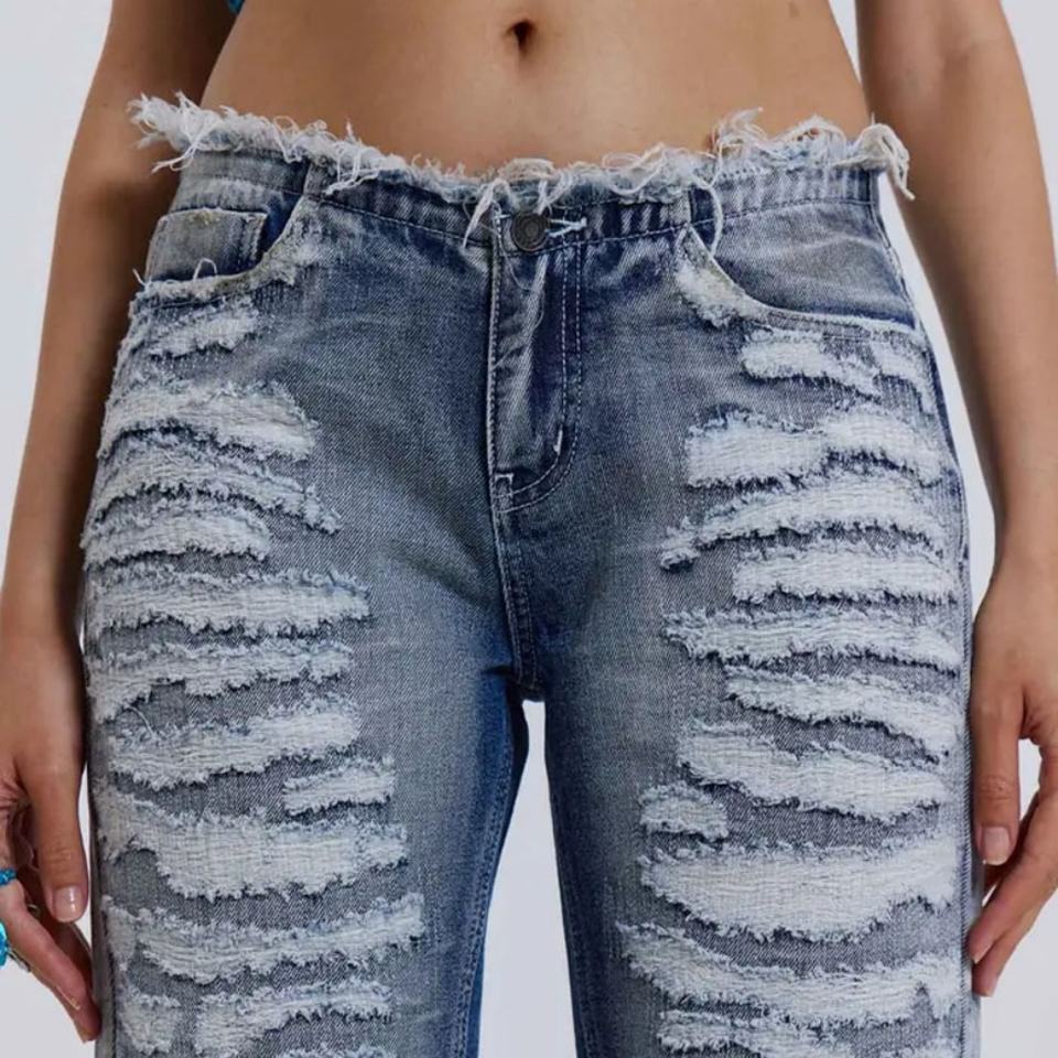 Jeans en denim Y2K, denim déchiré, taille basse, ceinture effilochée pour femmes