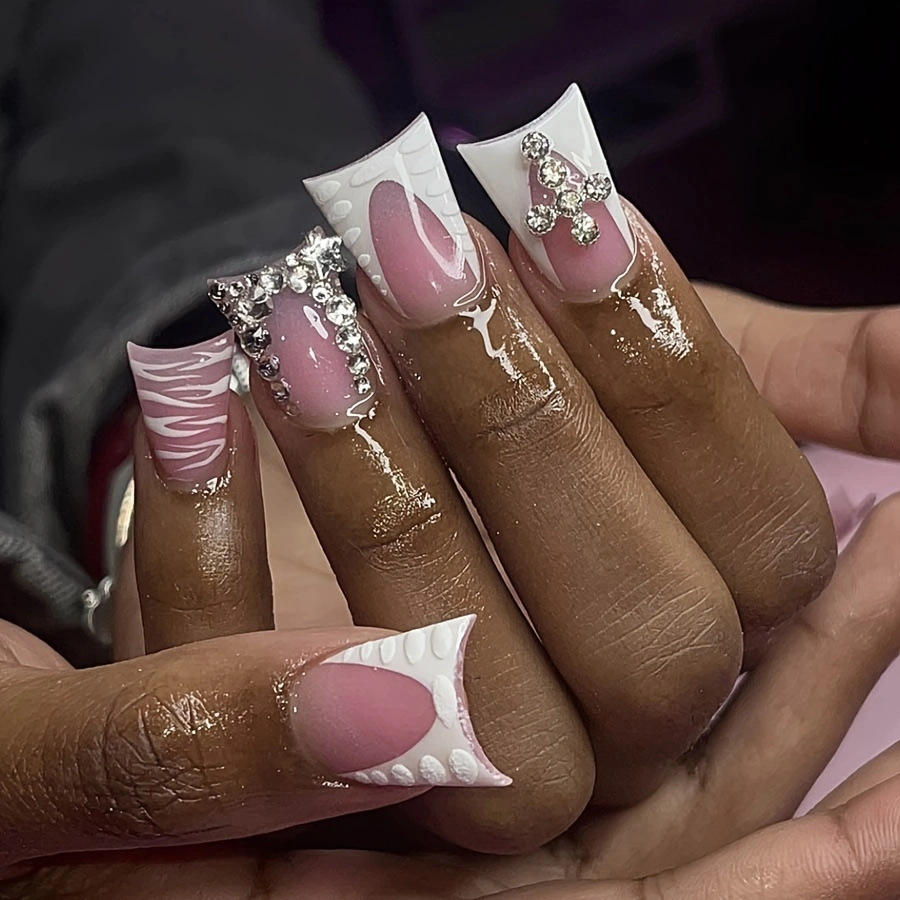 Ongles press-on Y2K en acrylique avec strass et breloques étoiles, style Baddie, pointe large, vente en gros, marque privée 2026