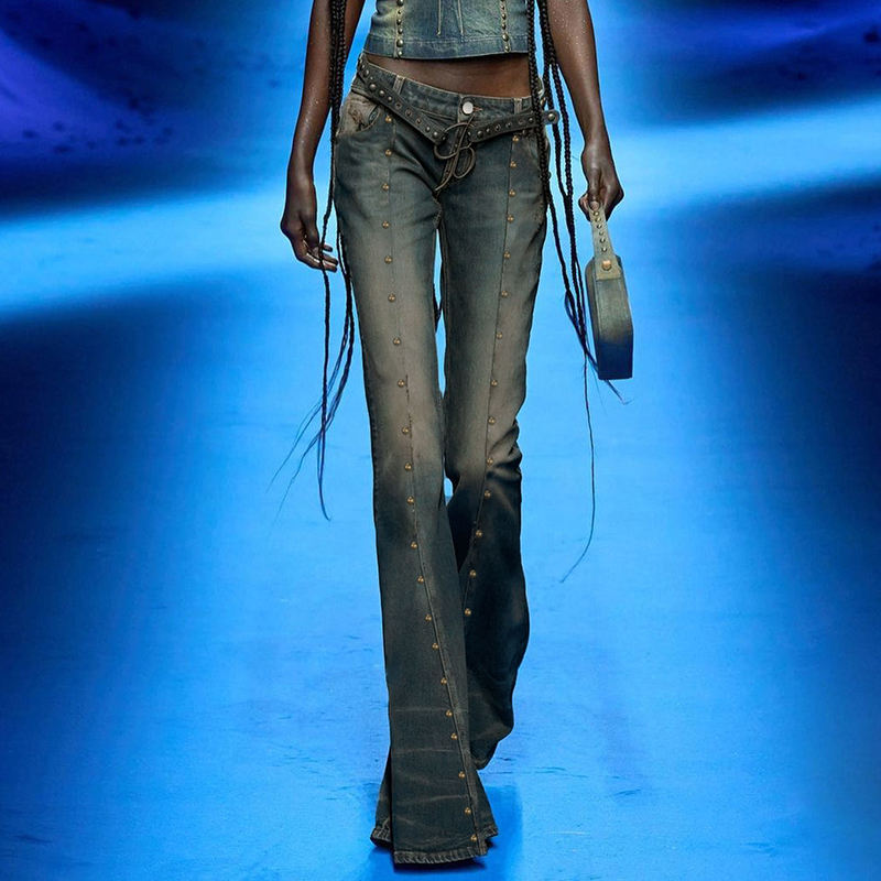 Jeans évasés gothiques Y2K, cloutés, taille basse, coupe bootcut, Dark Academia Rock Roll Denim