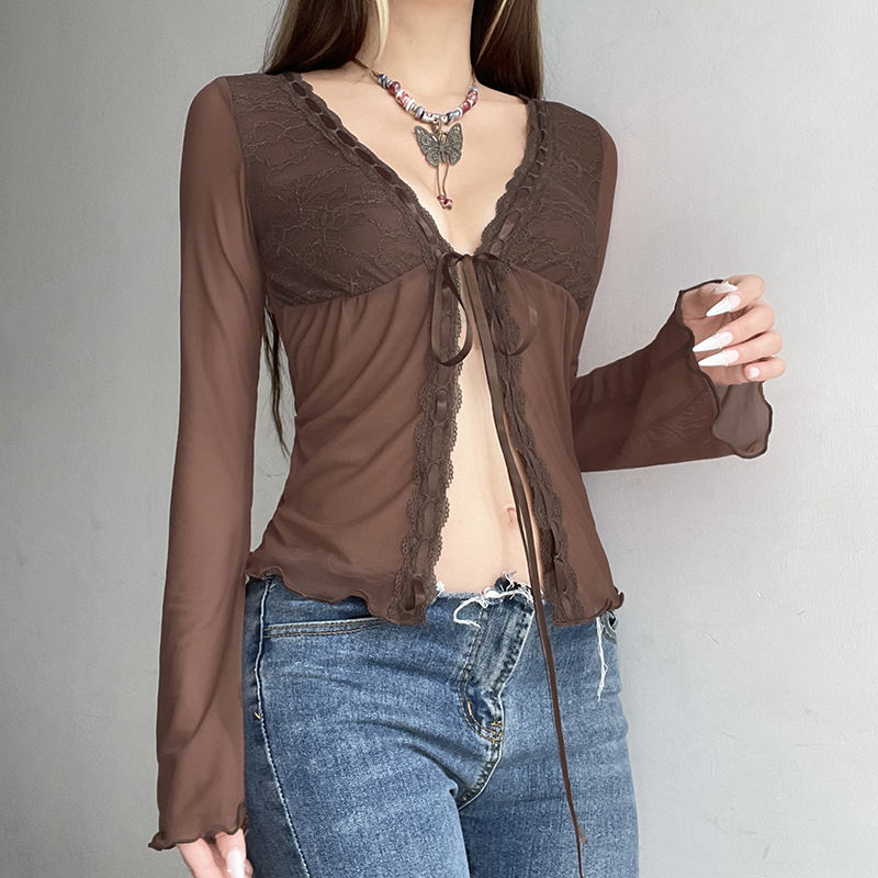 Haut décontracté d'été Y2K à manches longues, couleur unie, respirant, écologique, avec empiècements en dentelle tie-dye et maille transparente, à lacets