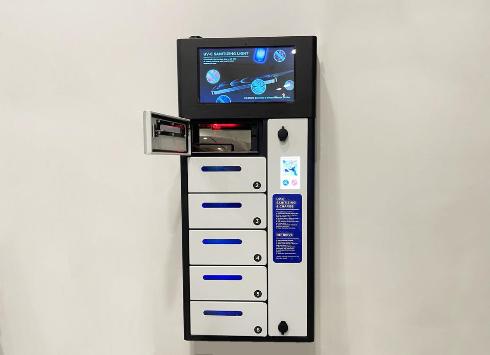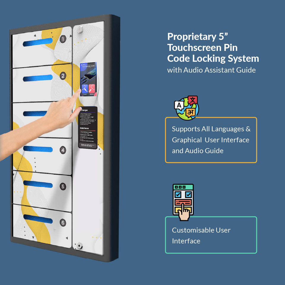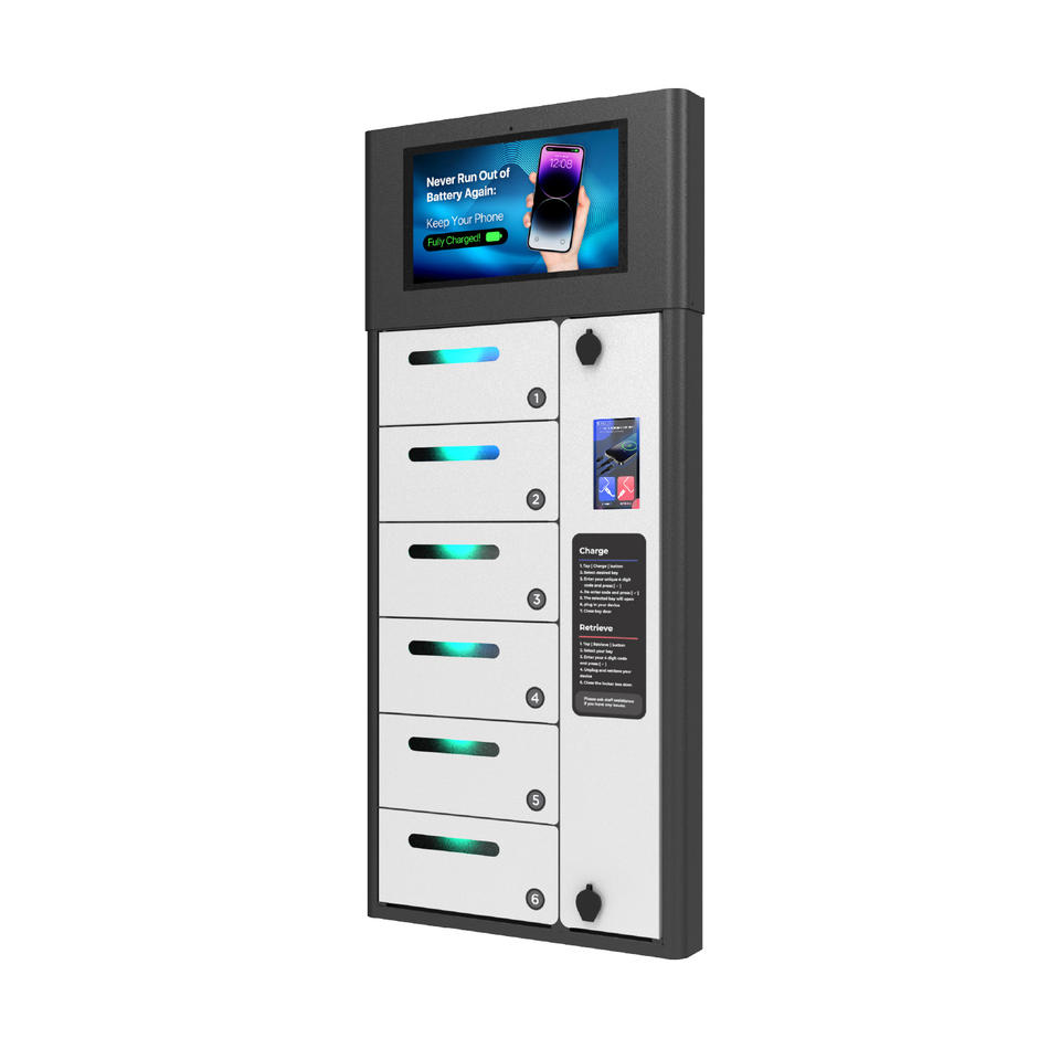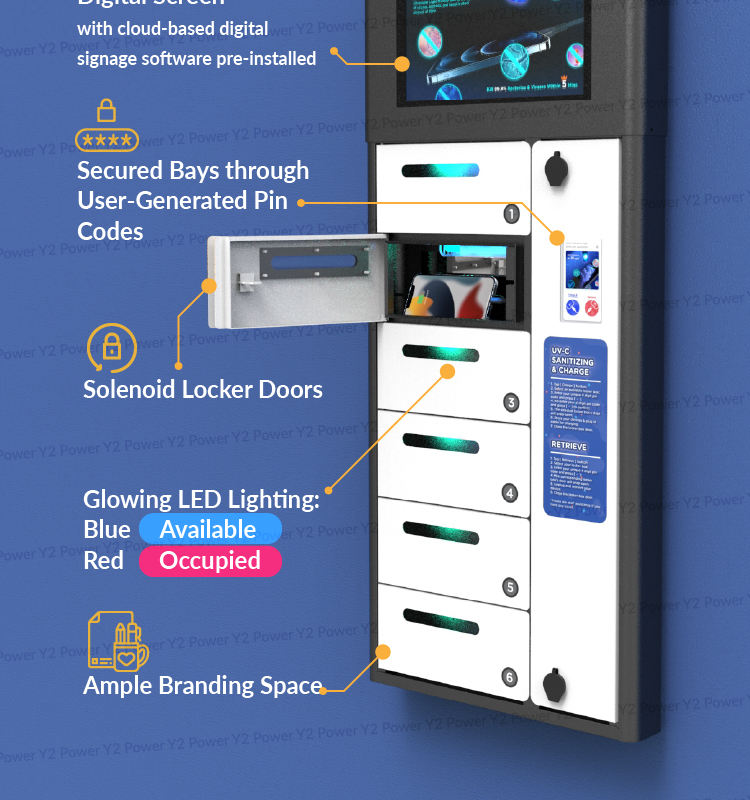 Y2Power ZEN Pro, casier de recharge de téléphone mural extérieur étanche à 6 baies avec écran publicitaire Android pour les événements