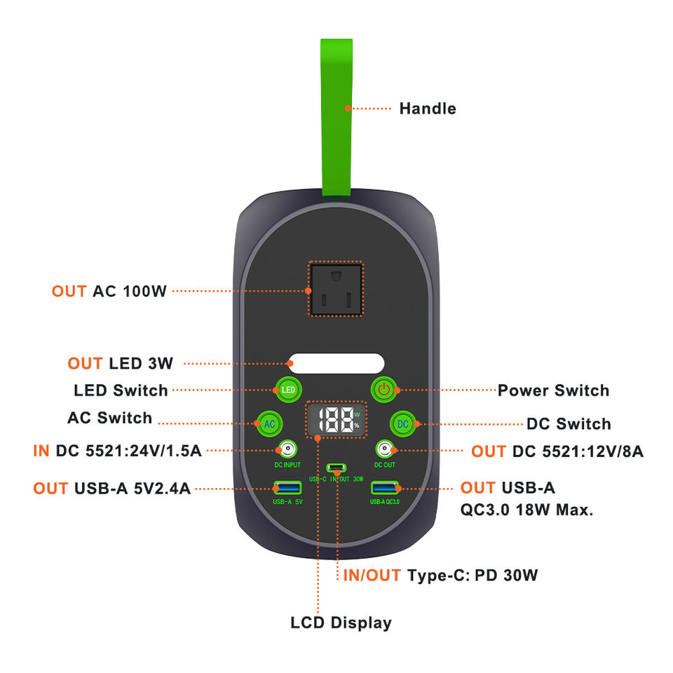 Usages spéciaux:Type C, Lampe de poche, Allumeur de cigare, USB, DC5521, AC