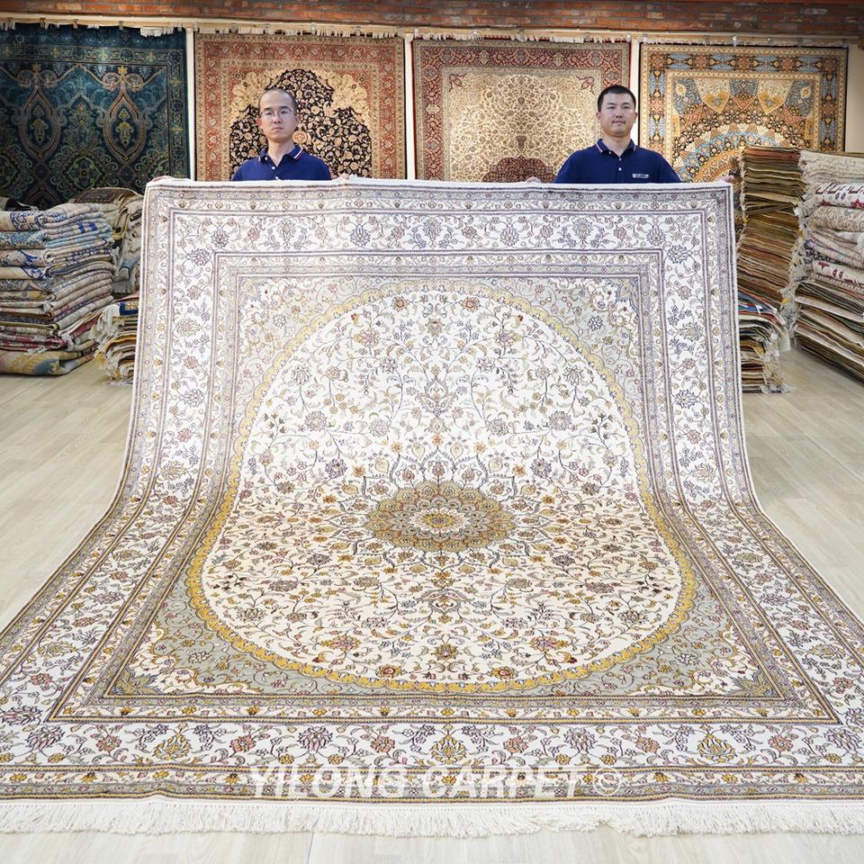 Tapis en soie du Cachemire noué à la main YILONG 8'x10', tapis vintage classique fait à la main, tapis Nain à vendre