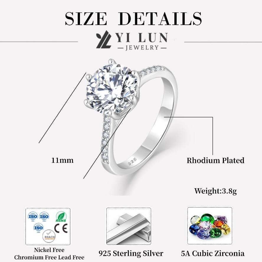YILUN Bague solitaire élégante en argent sterling 925 plaqué rhodium avec zircon cubique 4 carats