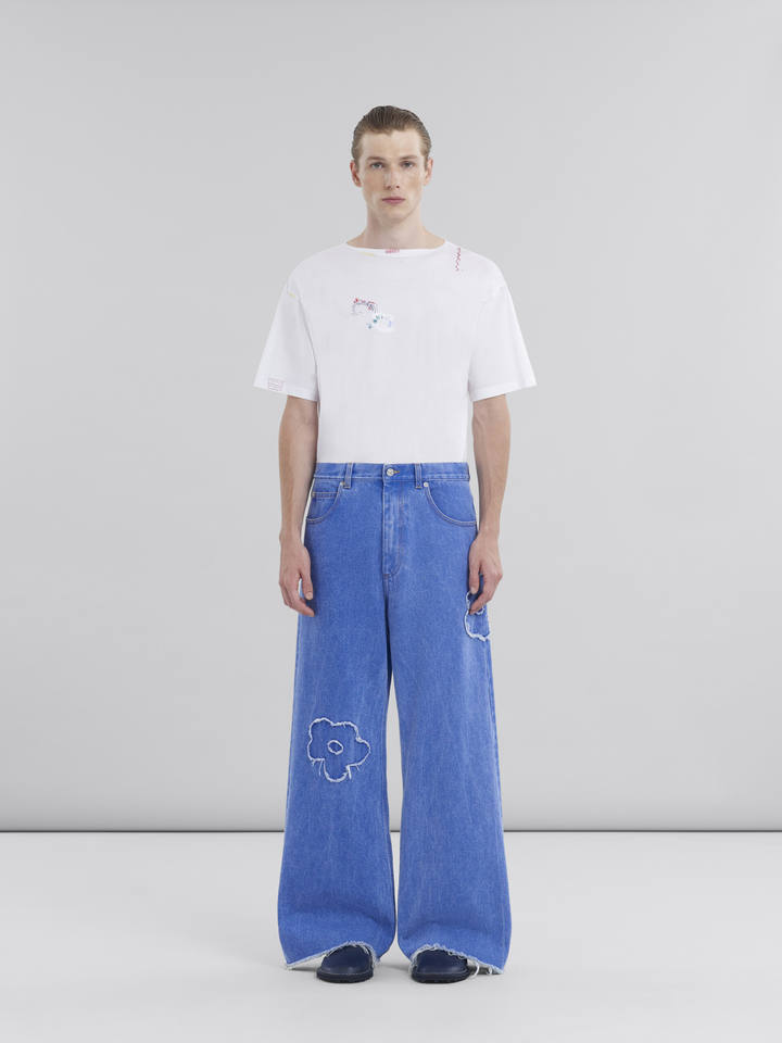 YKMOZI Jeans en denim imprimé de logo personnalisé de style vintage pour hommes, pantalon baggy à jambe large et droite délavée avec motif 3D