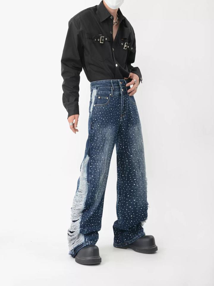 YKMOZI Original Loose Flare Jeans Rhinestone Raw Wash Denim 100% Cotton Denim