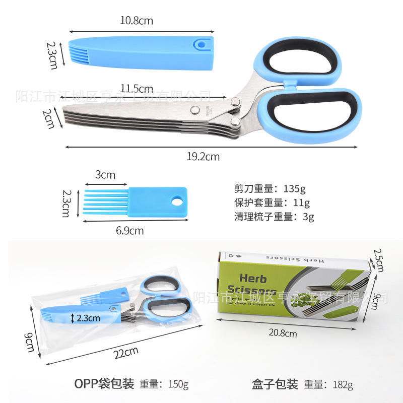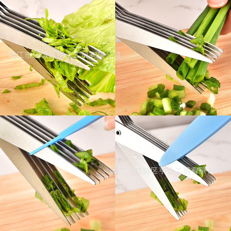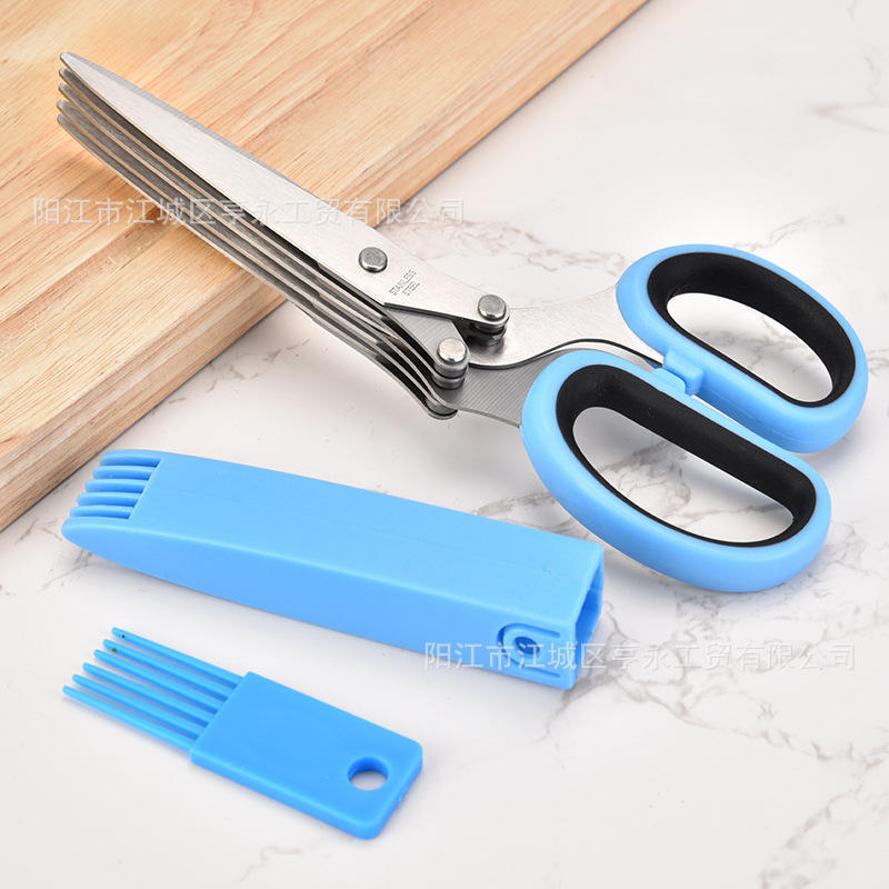 Ciseaux de cuisine multi-couches en acier inoxydable Yangjiang pour légumes et herbes, outil de coupe à 5 couches, manche bleu-noir