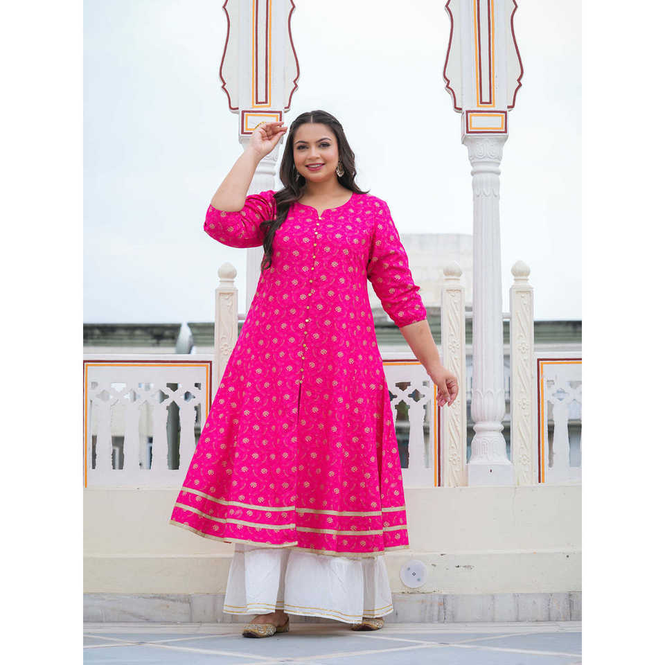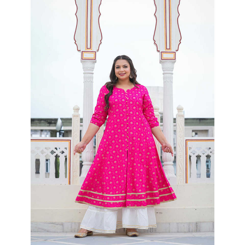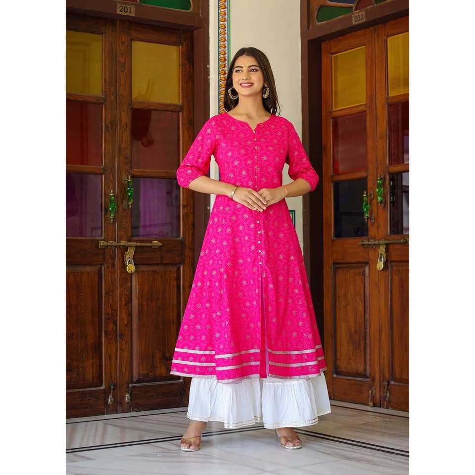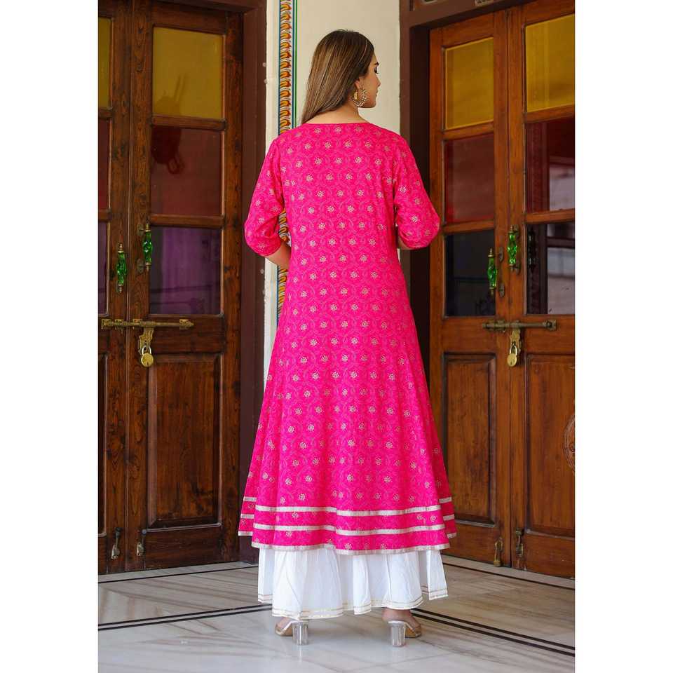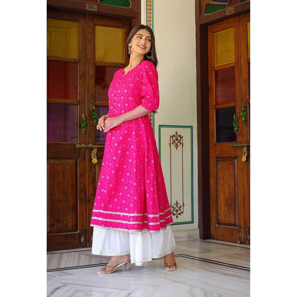 Yash Gallery Anarakali Kurta et ensemble d'accessoires rayonne rose imprimée en or vêtements musulmans traditionnels durables et élégants