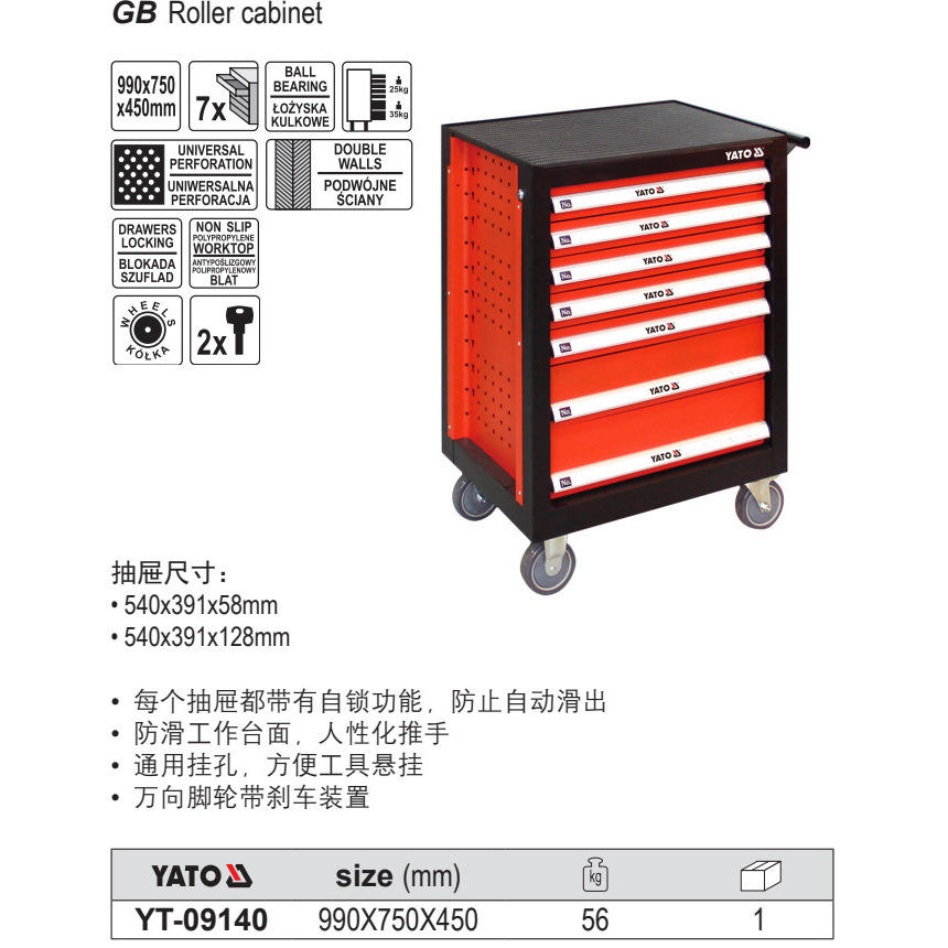 Chariot à outils mobile Yato à 7 tiroirs, en acier peint, boîte à outils roulante pour atelier YT 09140
