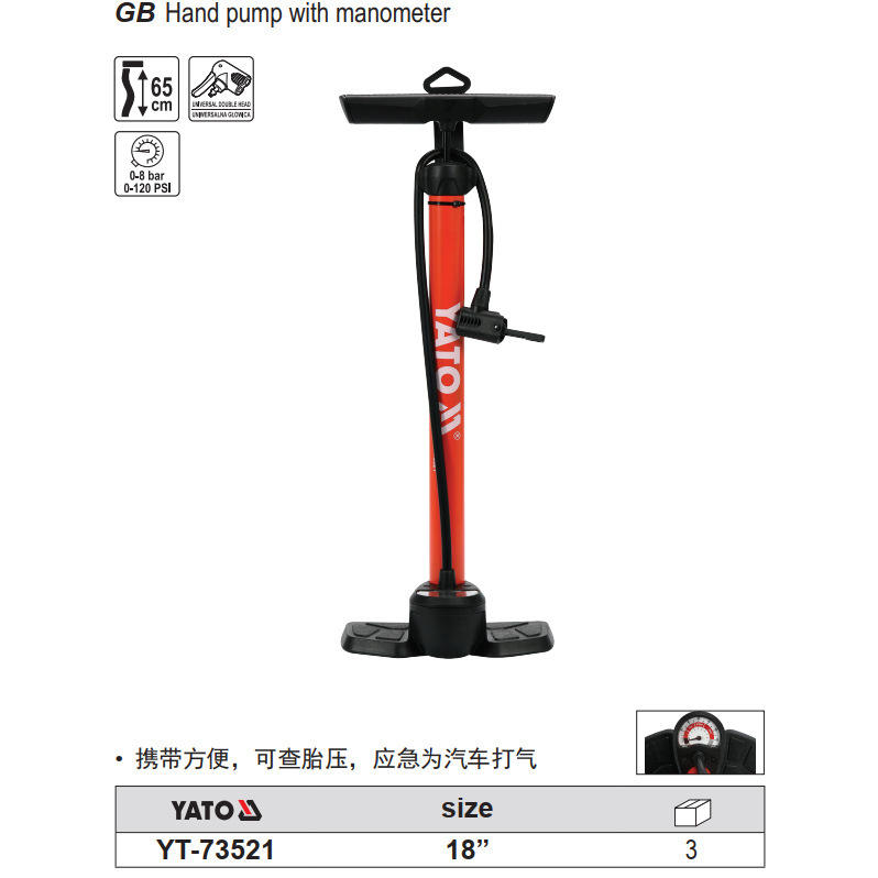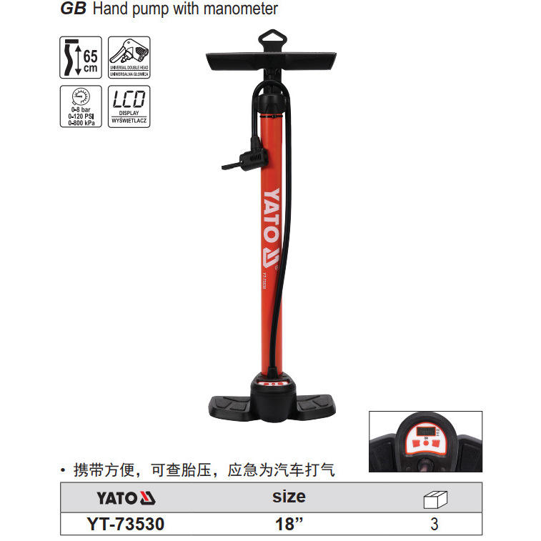 Pompe à main Yato avec manomètre 18 pouces en alliage d'aluminium pour gonflage de pneus de voiture