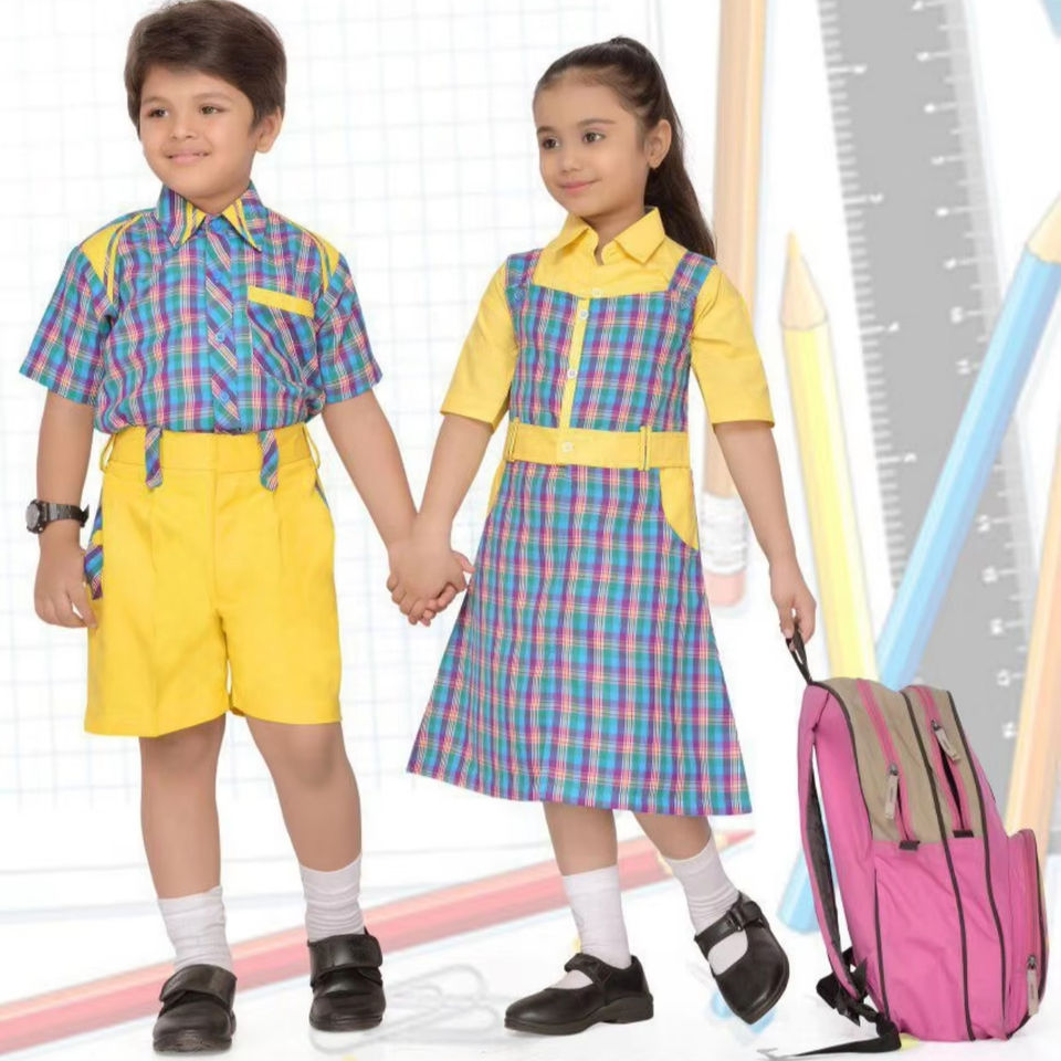 Uniformes d'école primaire à carreaux jaunes chemise et short pour garçon ensemble de robe robe chasuble pour fille