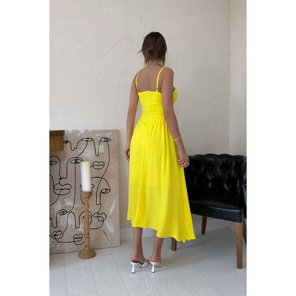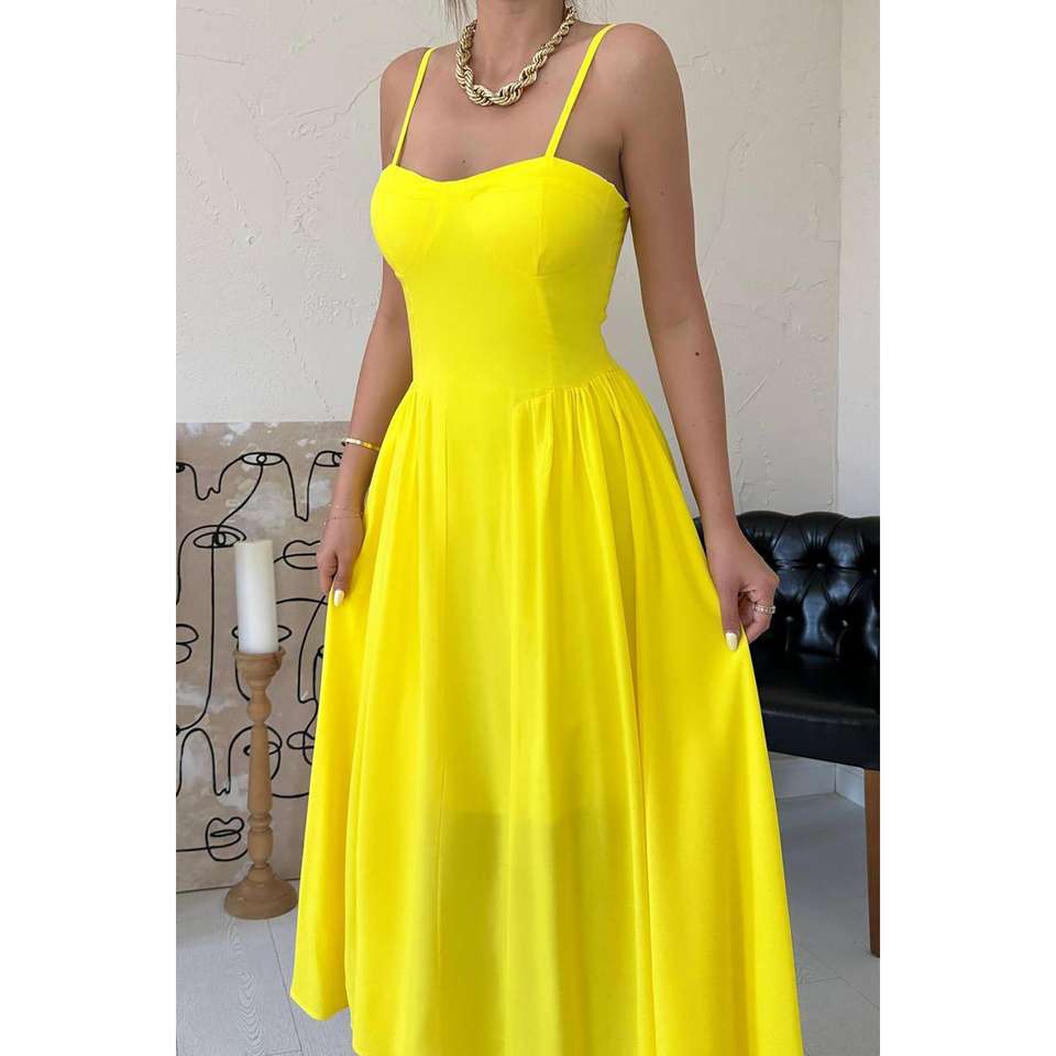 Robe de soirée longue mi-mollet en mousseline jaune, coupe trapèze, col carré, taille empire, froncée et respirante