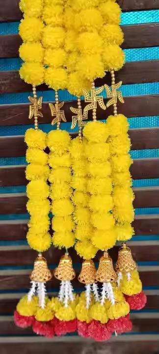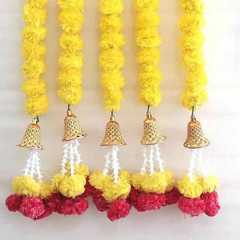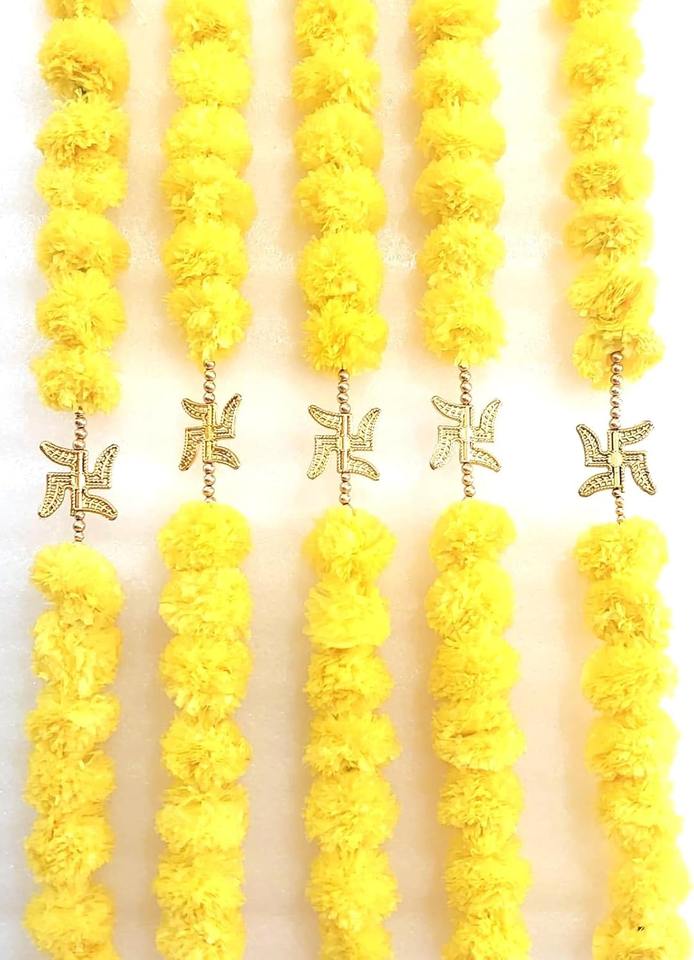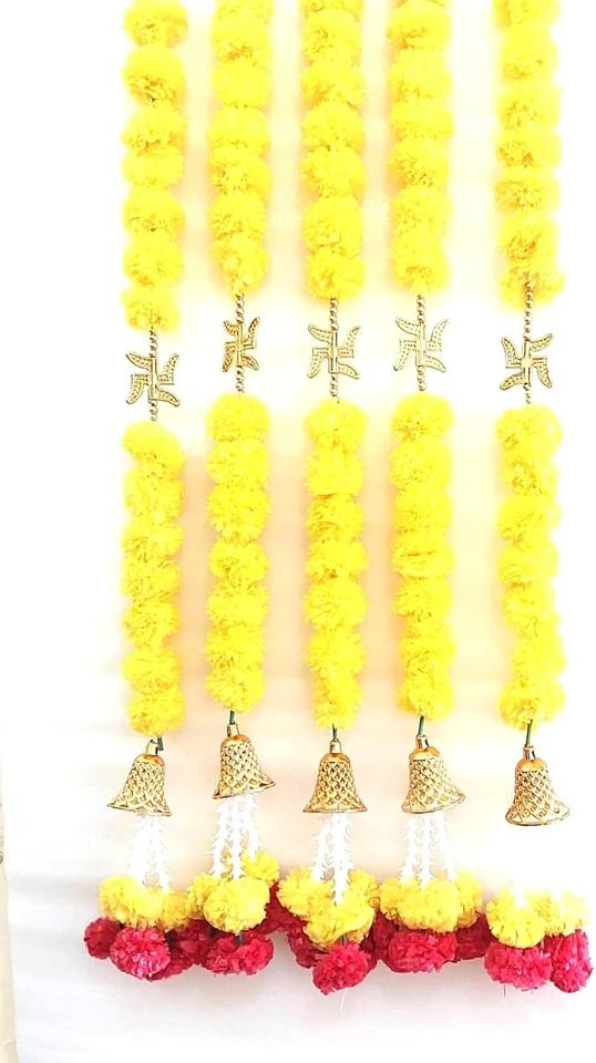 Guirlande de souci jaune avec conception de croix gammée et cloche Genda fleur suspendue pour Toran pour Diwali, Pooja, porte, décoration festive murale