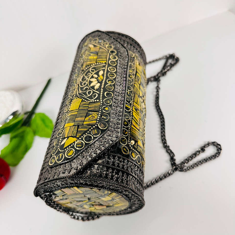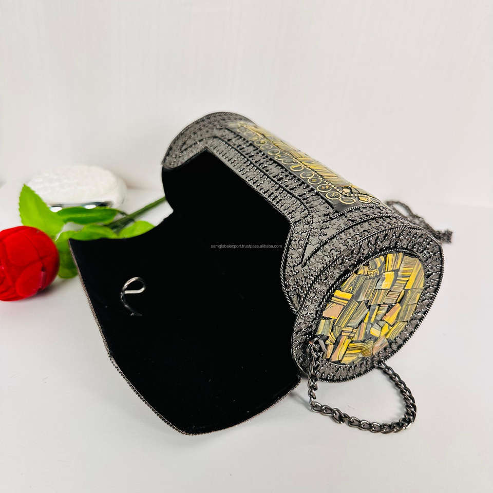 Pochette de soirée personnalisée en aluminium jaune mosaïque plaqué or, ornée de perles, style moderne, sculpture polie, pour mariage indien antique