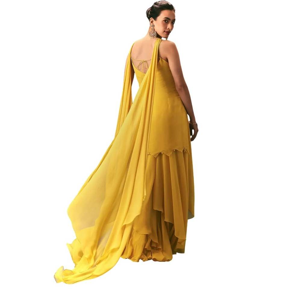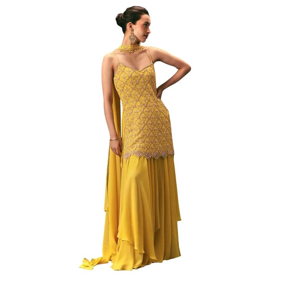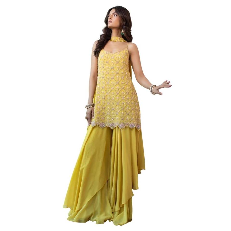 Ensemble Kurta Sharara en Georgette de soie avec travail à la main en sequins jaunes et dupatta pour mariage, réception festive, tenue de mariée