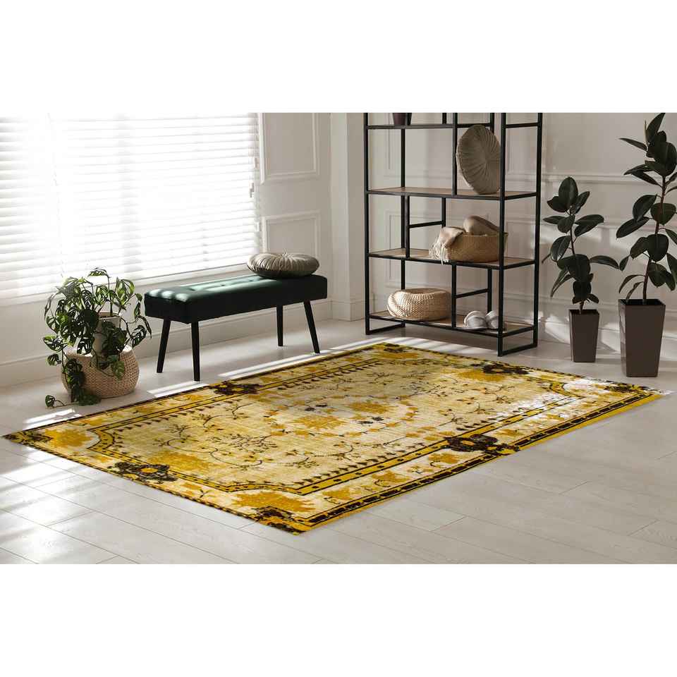 Tapis turc jaune : motif médaillon vintage, imprimé en 3D, tapis fin non tissé
