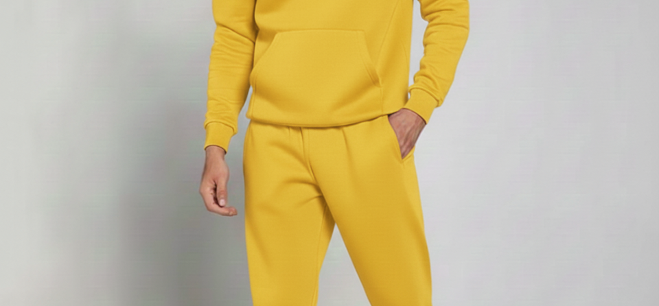 Ensemble de survêtement d'hiver unisexe jaune avec logo personnalisé, respirant, antibactérien, 100% coton polaire, motif uni, à capuche, décontracté