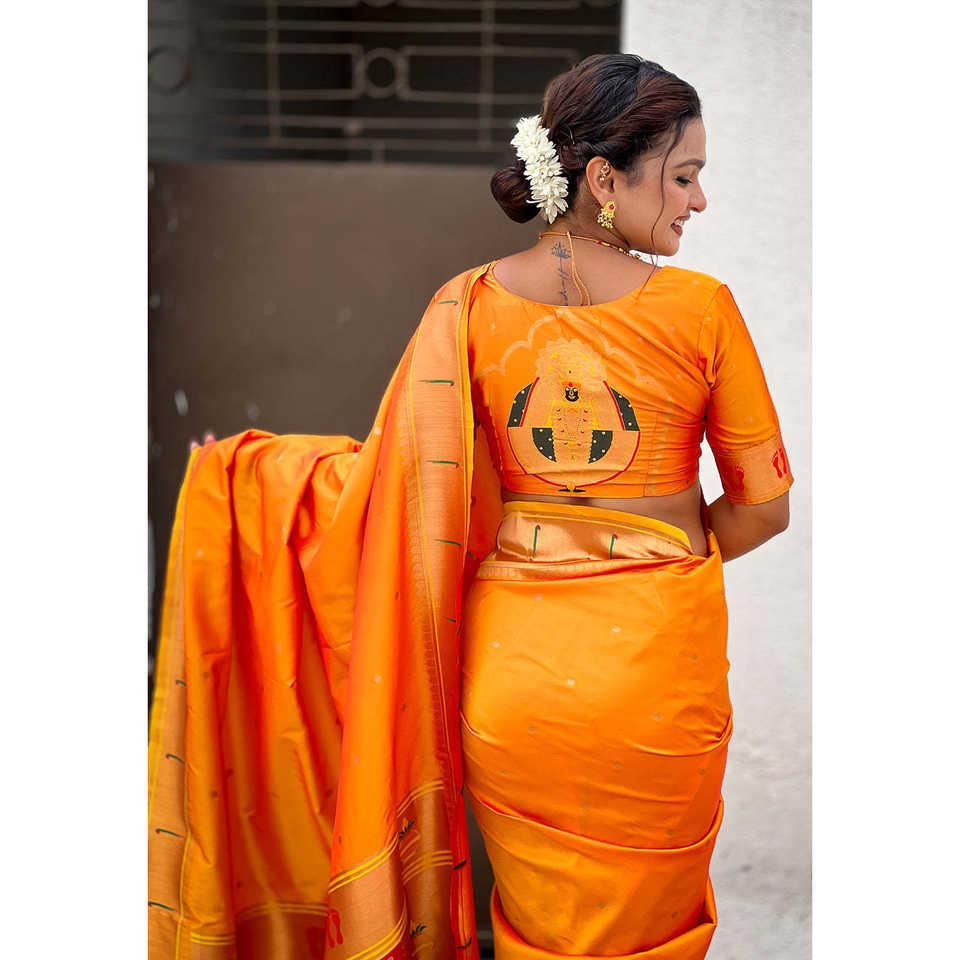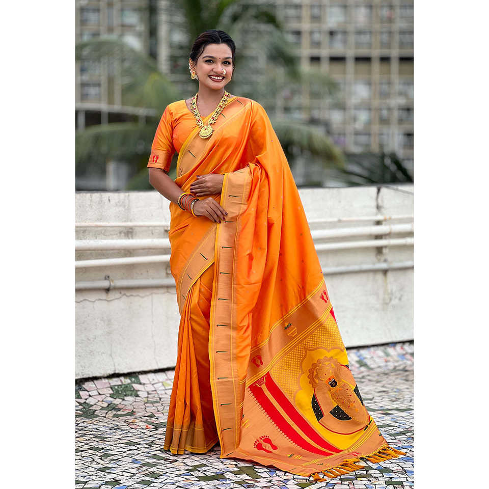 Yellow Zari Woven Mahalaxmi God Paithani Silk Saree Ethnic Scarves & Shawls