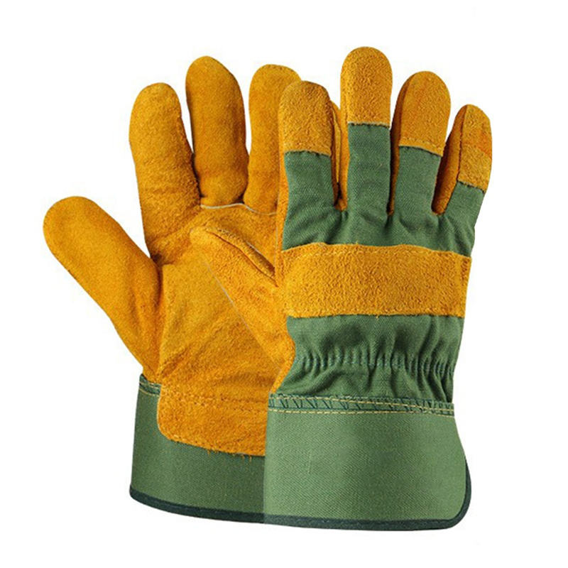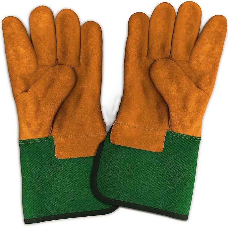 Gants de jardin en croûte de cuir jaune/poignets en caoutchouc vert gants anti-épine en croûte de cuir de vache/gants de jardinage avec logo personnalisé longs