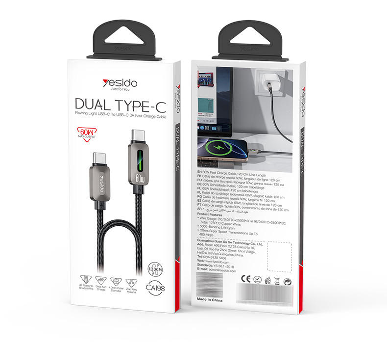 Yesido 1.2 mètres 60W charge rapide type-c à type-c CarPlay câble de données en alliage de zinc applicable CA198