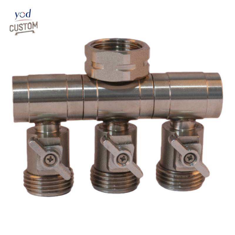 Collecteur d'eau en laiton haute pression usiné CNC de précision Yod, 3 voies, 3/4 pouce NPT, sans plomb, connecteur DZR pour tuyau de jardin