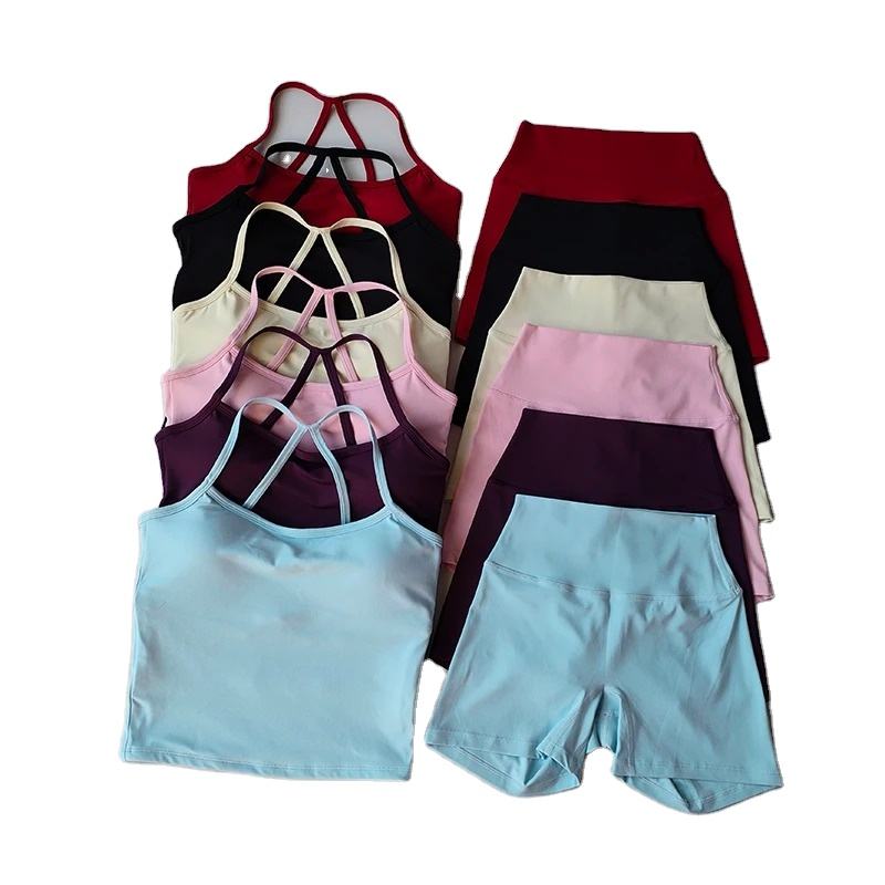 Yoga Gym Set Halter Top High Waist Shorts Backless Tights Bra Vest Double Layer Spandex/Nylon Seamless Stretch Ribbed Buttocks