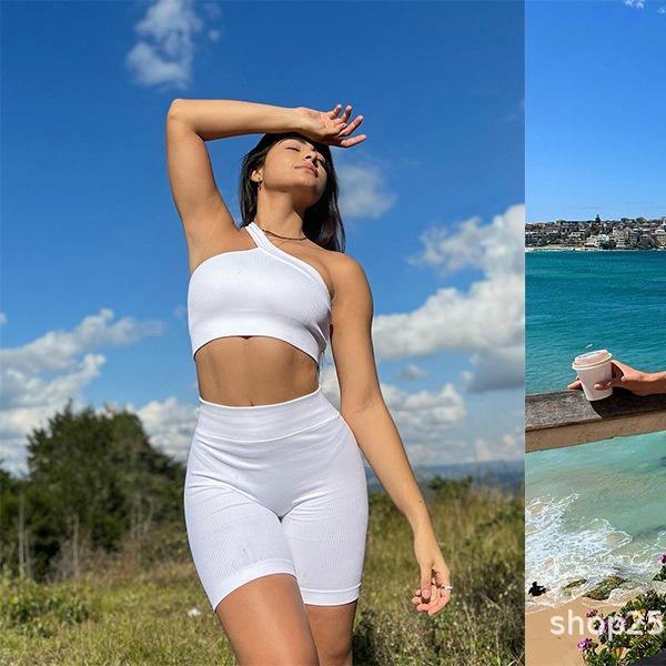 Ensemble de yoga trois pièces pour femme, asymétrique à une épaule, dos nu, côtelé, sans couture, uni, respirant, séchage rapide, taille haute, 100% polyester, pour le fitness