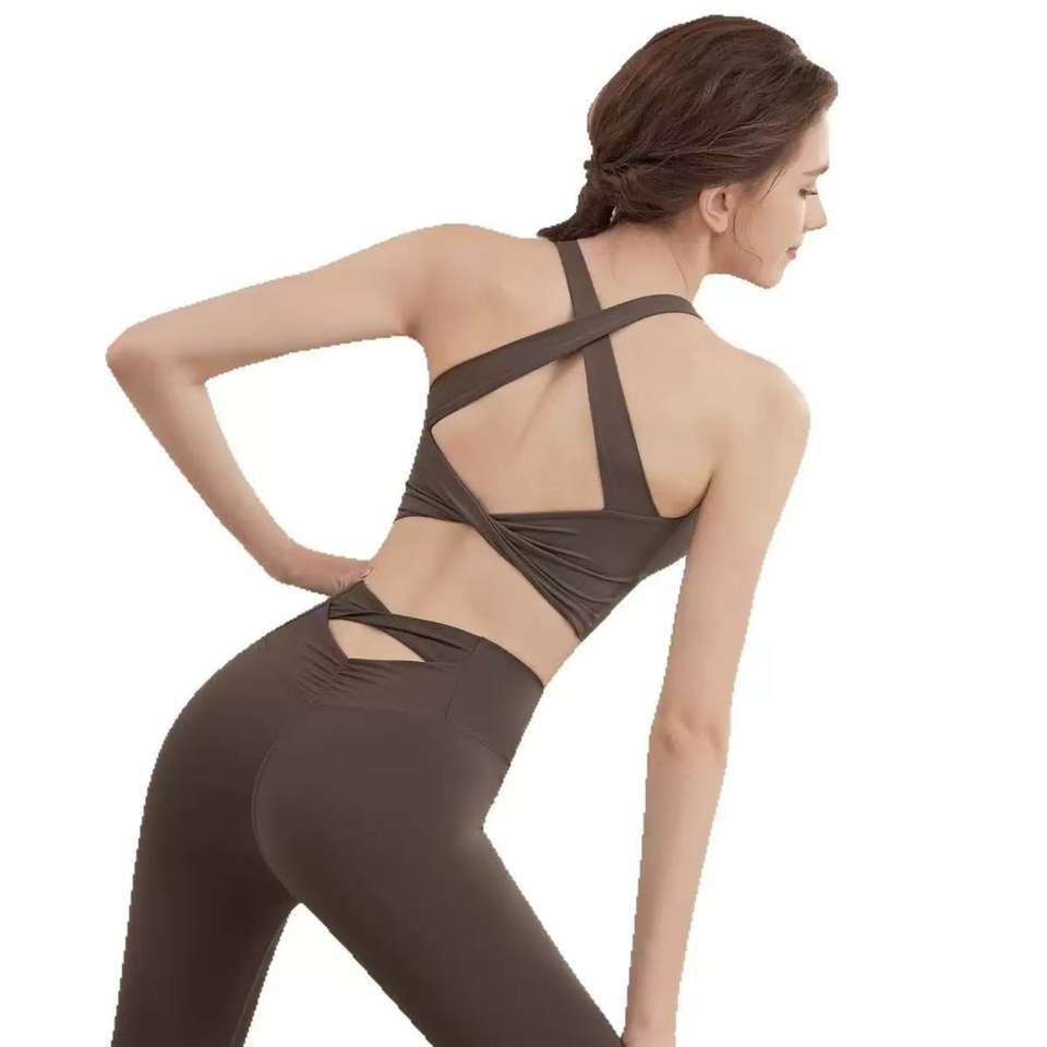 Yoga Women's Halter Neck Deep V Neck Quick-Drying High Waist 2-Piece Fitness Suit Long-Sleeved T-Shirt Chest Pad Solid Leopard