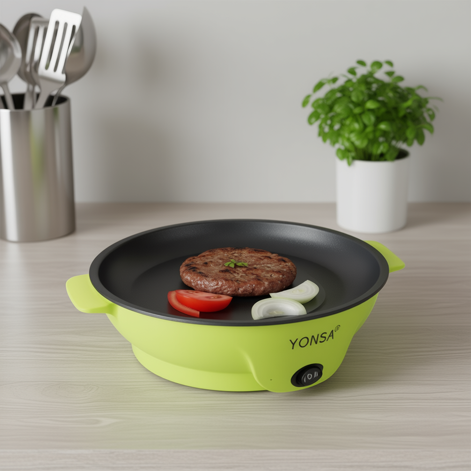 Poêle électrique Yonsa 1200W ronde antiadhésive en acier inoxydable à commande manuelle, ustensile de cuisine domestique avec revêtement PTFE