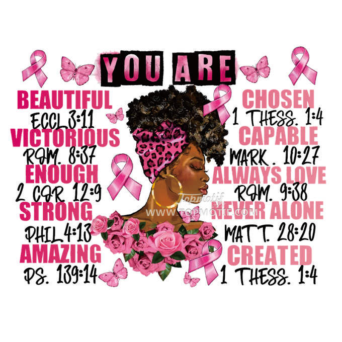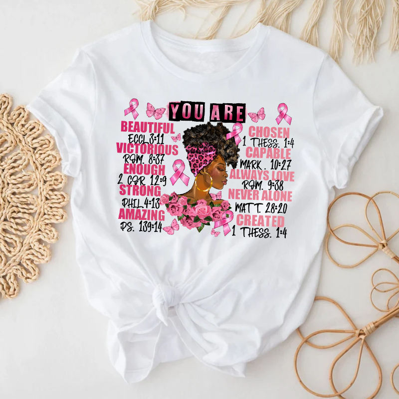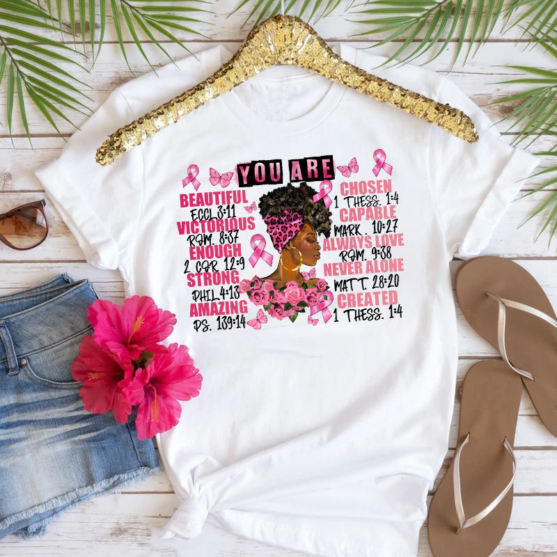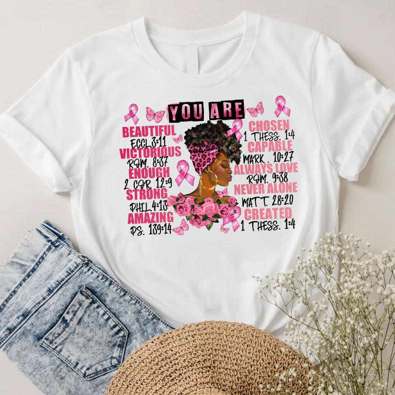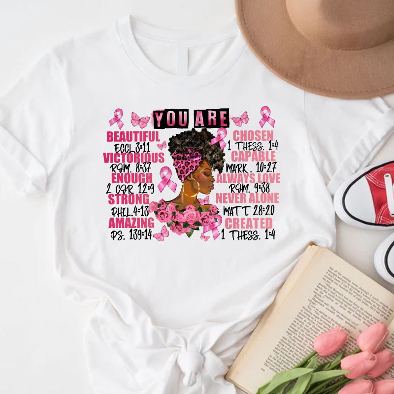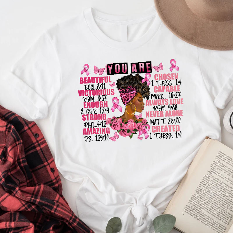You Are Beautiful Chosen Victorious Capable Always Love Strong Never Alone Amazing Created Breast Cancer Heat Transfer Printing