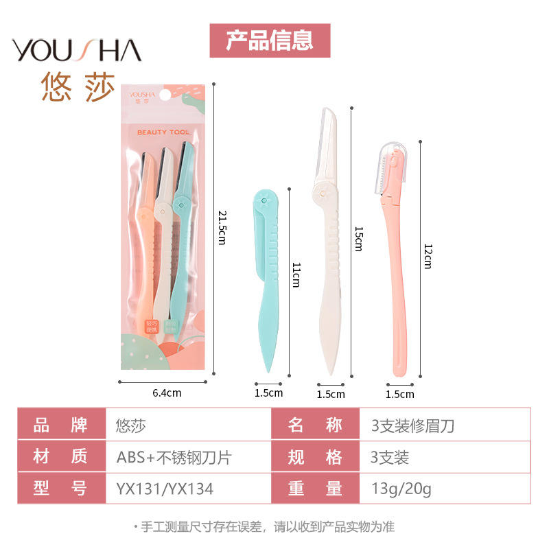 Rasoir à sourcils Yousha, lot de 3, lames en acier inoxydable, manche en ABS, multicolore, YX131 YX134
