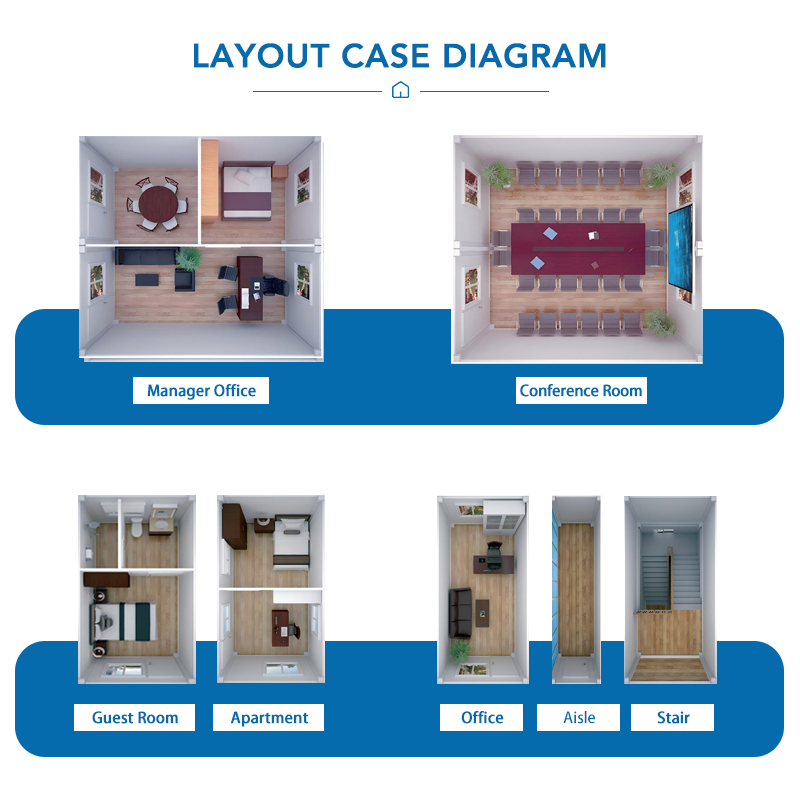 Appartement, Dortoir, Bar, Restaurant, Boutique, Toilettes, Parking, Maison vivante de conteneur, Maison de conteneur, Maison garde, Hôtel, Villa, Immeuble de bureaux, Hôpital, École, Sites sportifs, Installations de loisirs, Supermarché, Entrepôt, Parc, Cuisine, Salle de bain, Salle de sport, Blanchisserie, Garage et Abri, Stockage et Placard, Usines, Campagne, Chambre d'enfant, VestiaireApplication