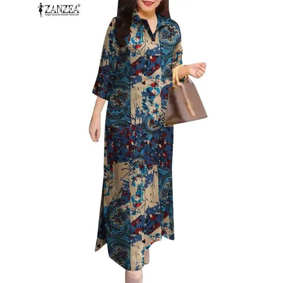 ZANZEA femmes 2024 automne Maxi chemise robe Vintage imprimé fleuri coton XL taille nouvelle robe longue avec col à revers et manches 3/4