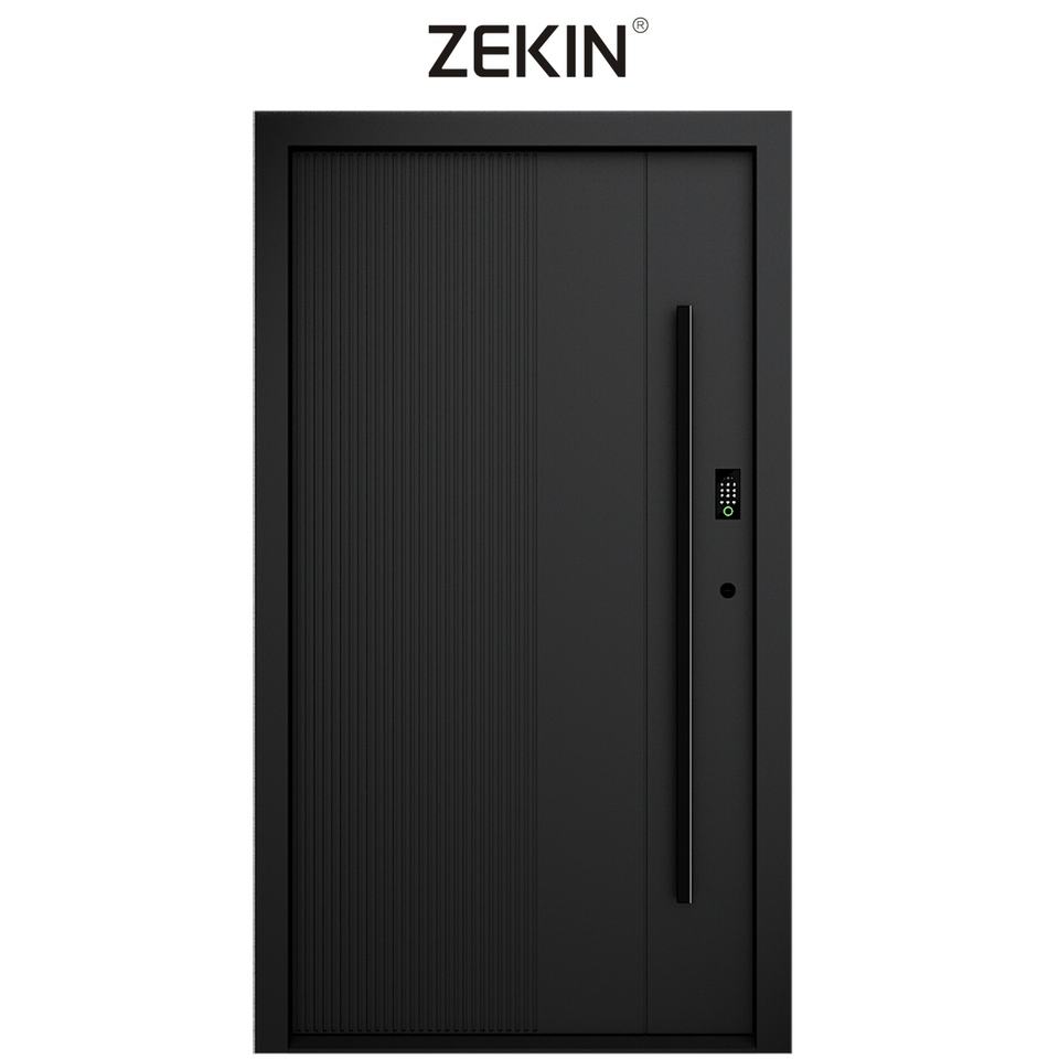 Porte d'entrée moderne ZEKIN DOOR Factory, en métal noir, sécurisée, pivotante, étanche, en acier inoxydable et verre, style français.
