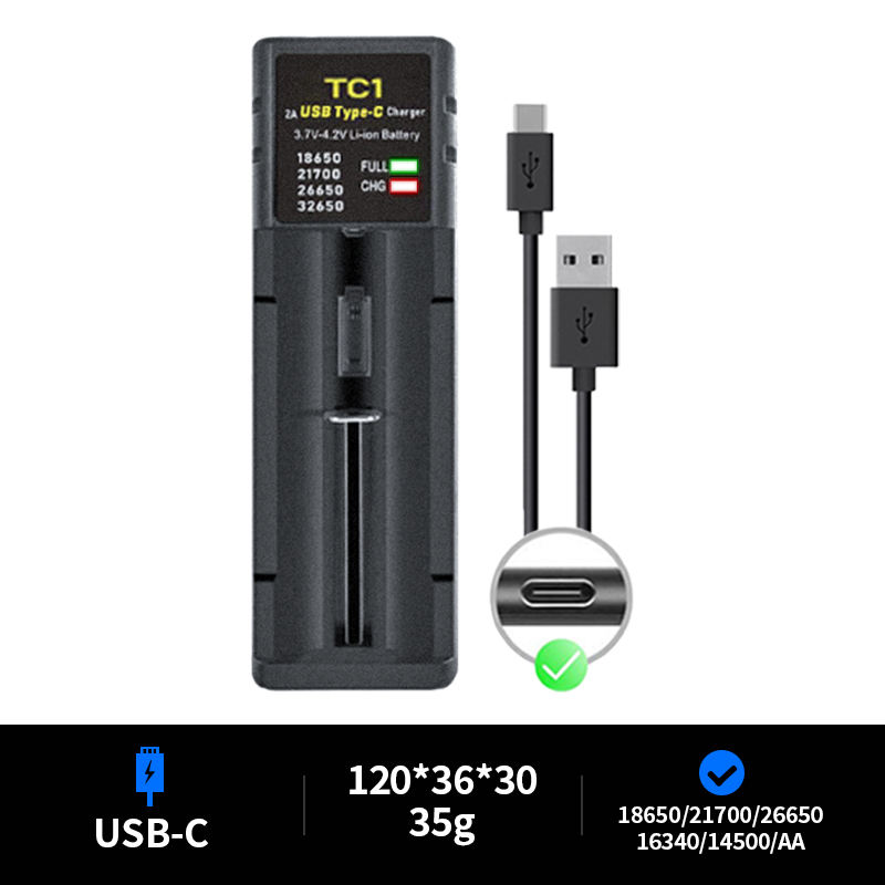 Chargeur de batterie rapide USB C portable ZEROBEAM, 1 emplacement, éclairage LED, pour cellules rechargeables Li-Ion NiMH 21700 18650 26650