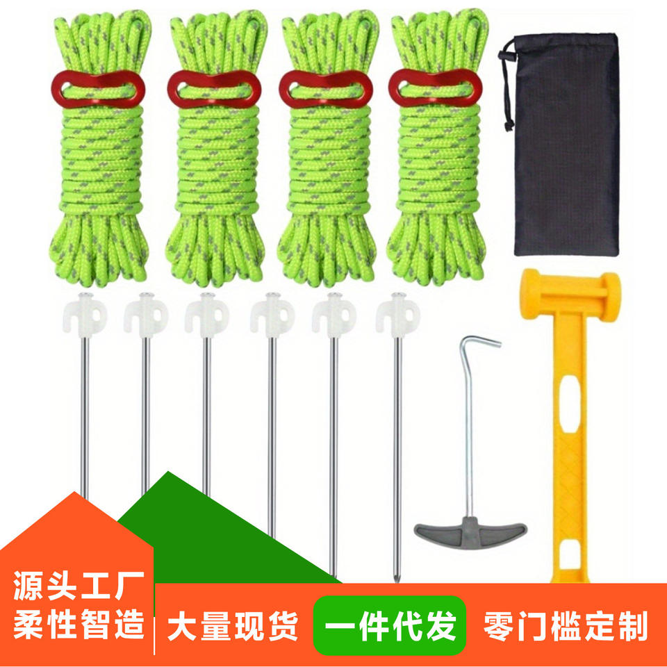 ZJ-PJ005 Ensemble de cordes de tente en polyester vert de 12 m avec piquets pour le camping toutes saisons
