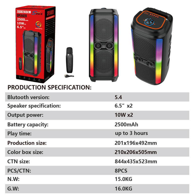 Enceinte sans fil ZQS6240XW double 6,5 pouces 10W avec son stéréo et lumières RGB pour fêtes, enceinte sans fil 1500mAh pour intérieur/extérieur
